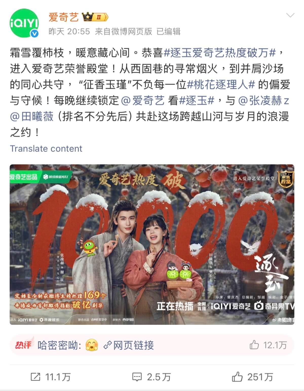 先來看看,愛奇藝率先發戰報,恭喜《逐玉》在平台內熱度破萬👇