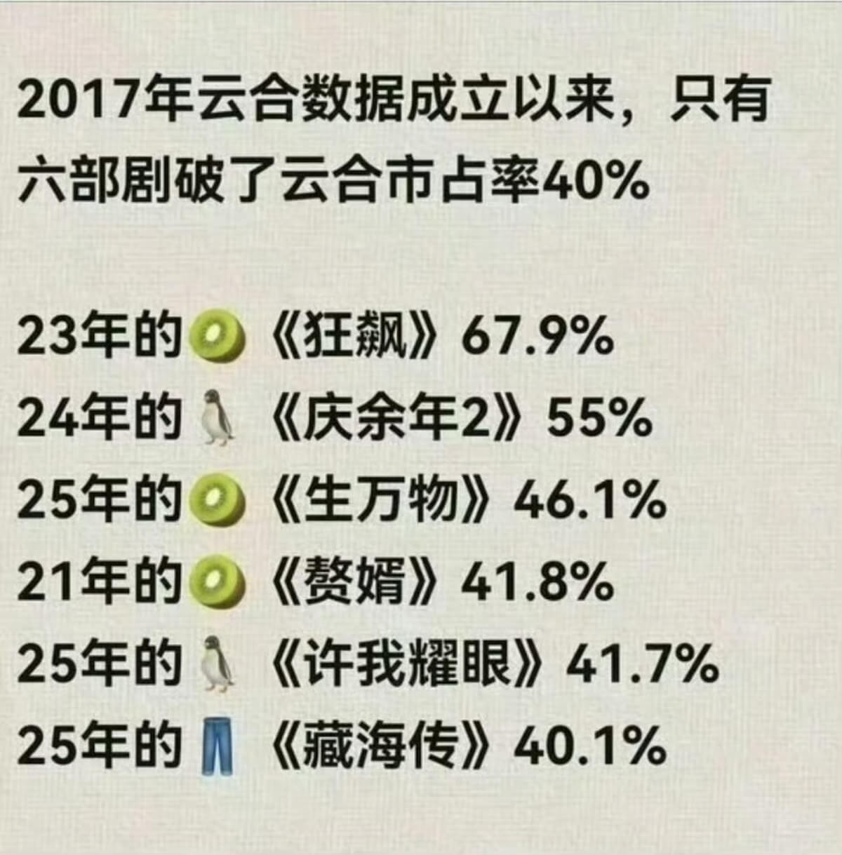 市佔率40%是什麼概念?從雲和數據2017年成立以來,只有6部劇突破了雲合市佔率40%,最新的兩部,就是趙露思的《許我耀眼》,以及肖戰的《藏海傳》👇