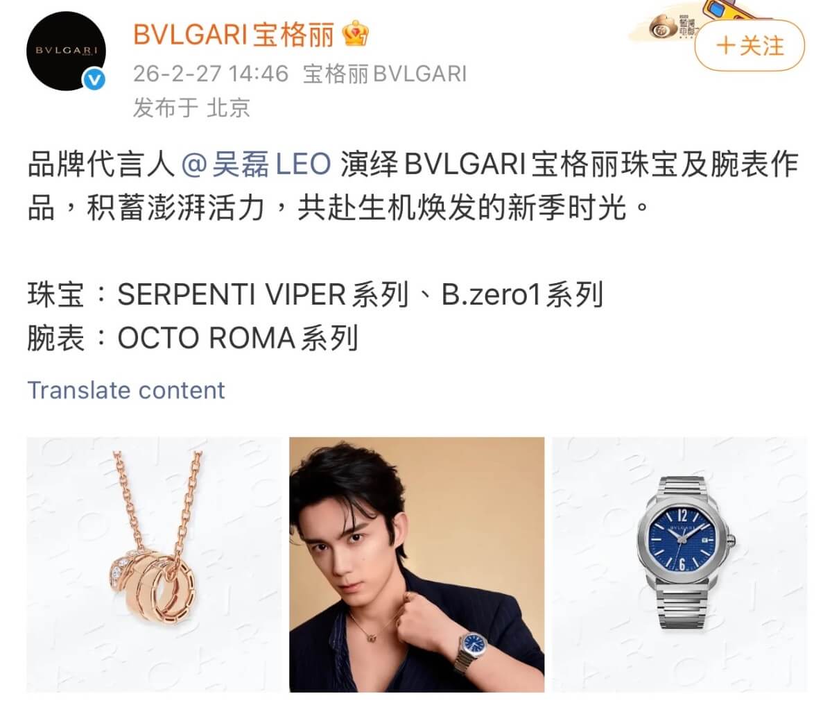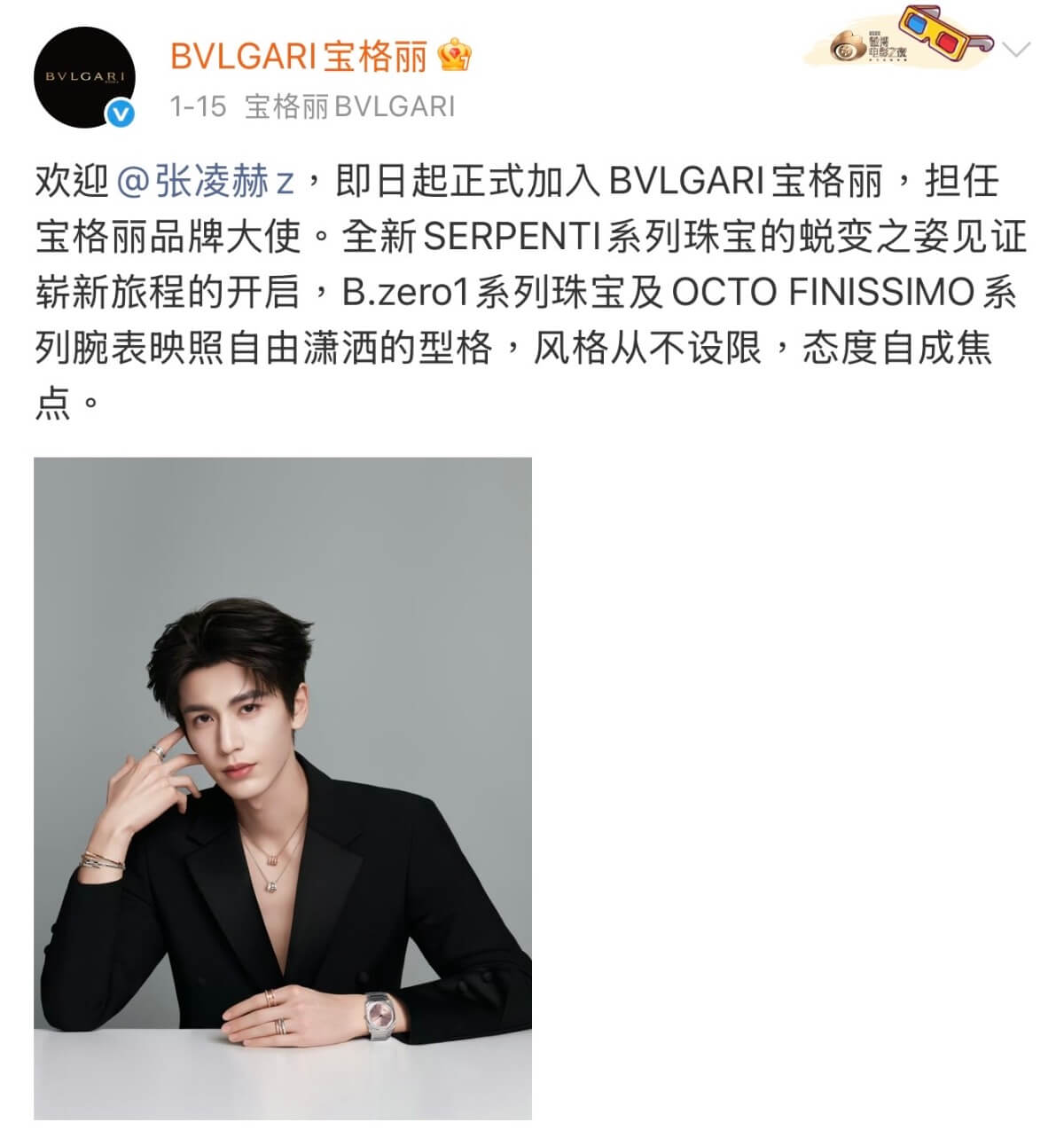 是噠,為什麼用了「又」?原因是因為張凌赫日前官宣,成為了寶格麗品牌大使👇