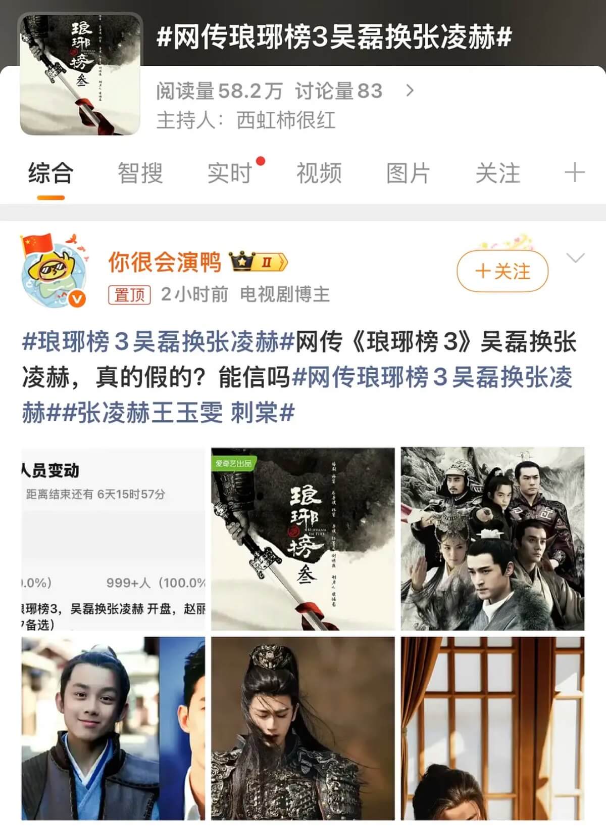 現在兩人又被扯在一起,原因是網傳張凌赫將替換吳磊在《琅琊榜3》的角色!