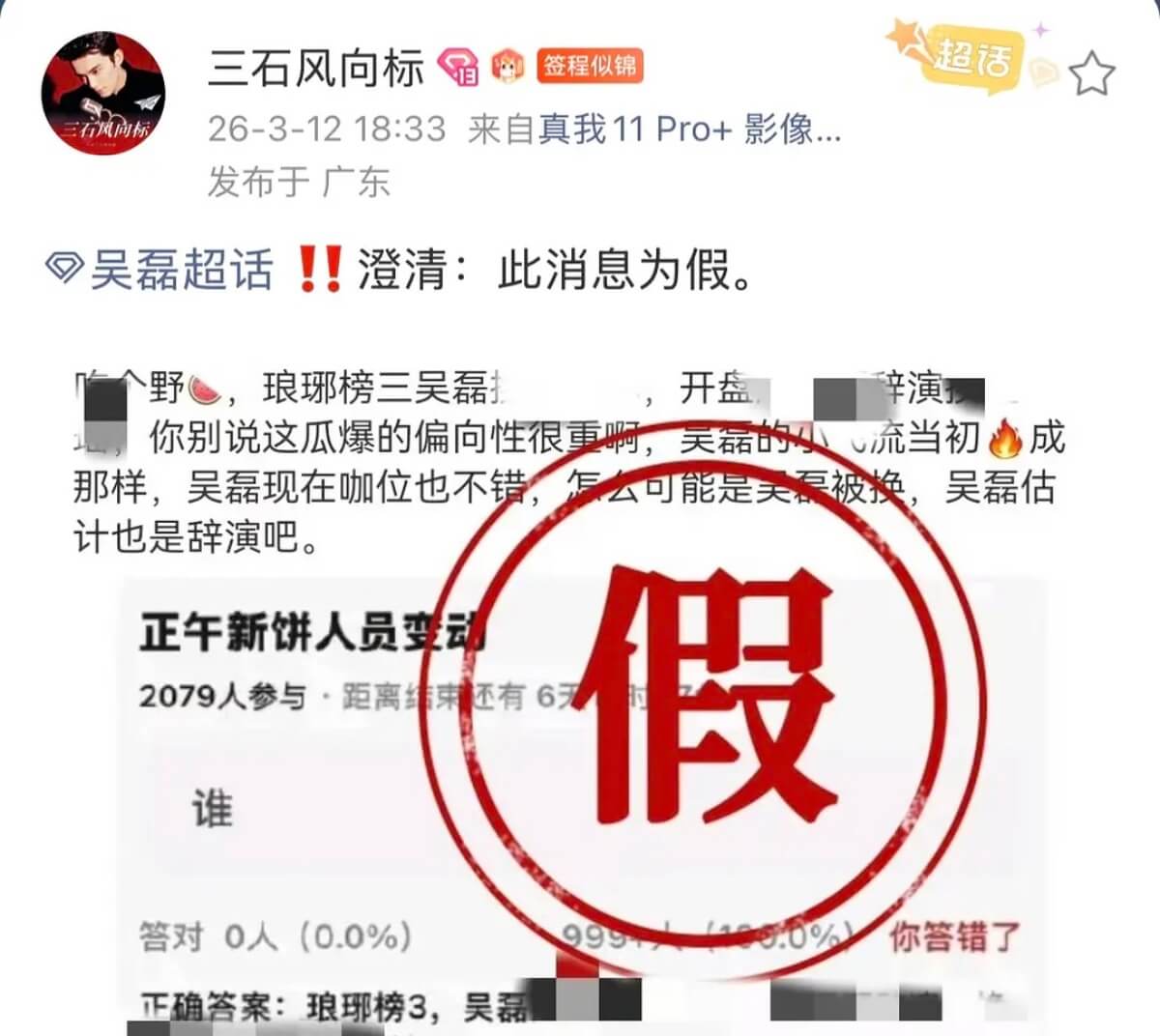 消息傳出之後,就有不少網友炮轟,不接受這樣的演員安排!但吳磊方行動很迅速,立刻發聲明打假👇