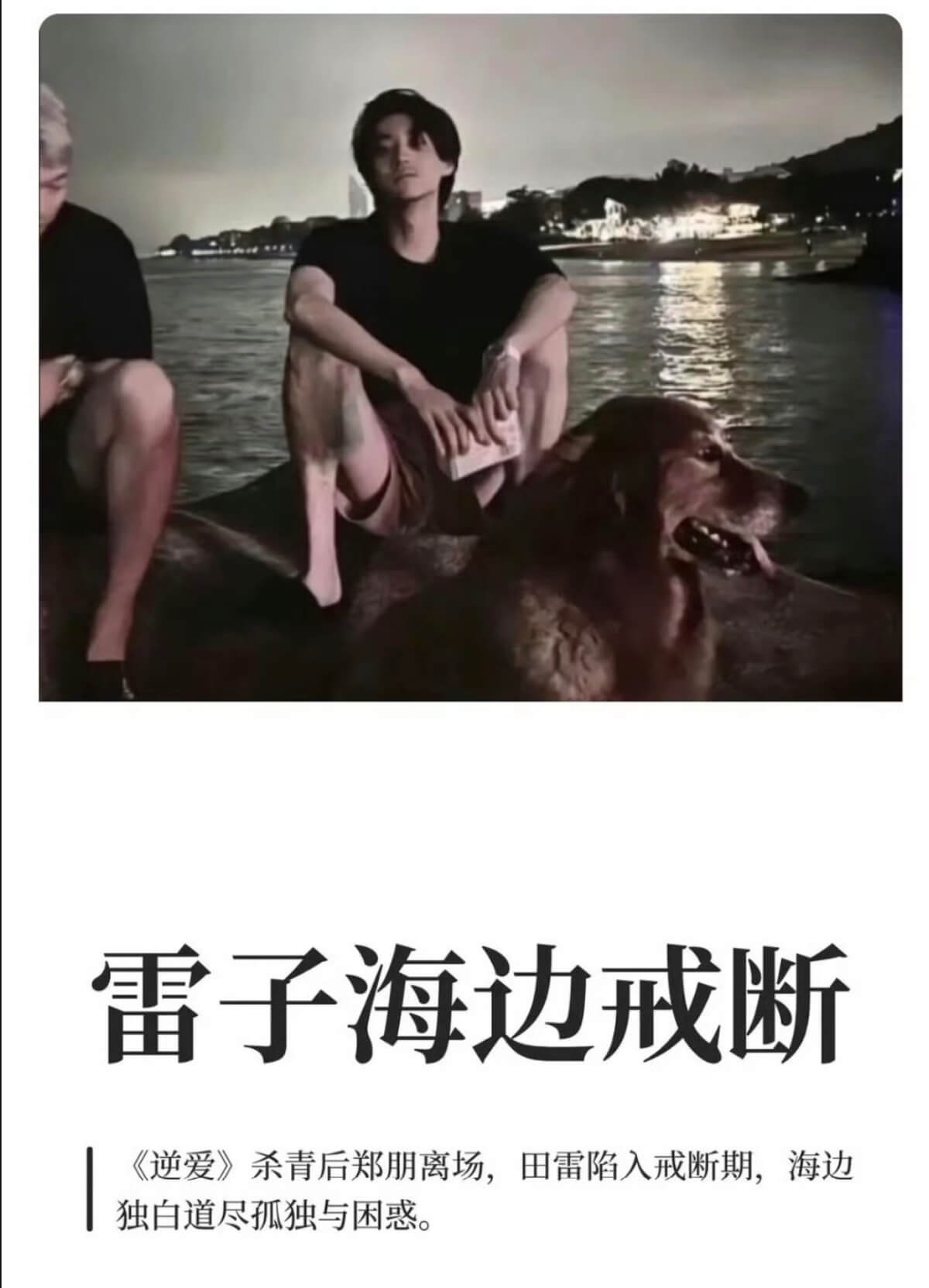 兩人劇播完之後,吸引了一波真人CP粉,而其中一個嗑糖點,就是田栩寧被指在《逆愛》殺青之後,因為捨不得梓渝而出現「截斷期」,在廈門海邊拍下了這張一人一狗,充滿頹廢風的照片👇