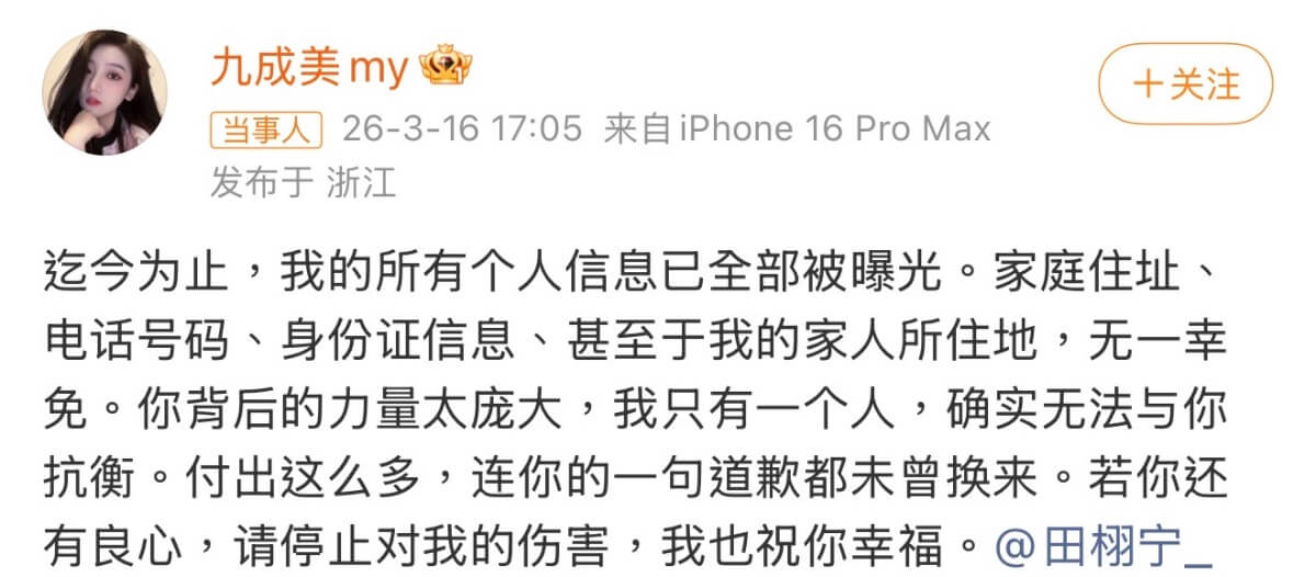 目前,九成美表示自己所有個人資料已經被公開,希望田栩寧停止對自己的傷害👇