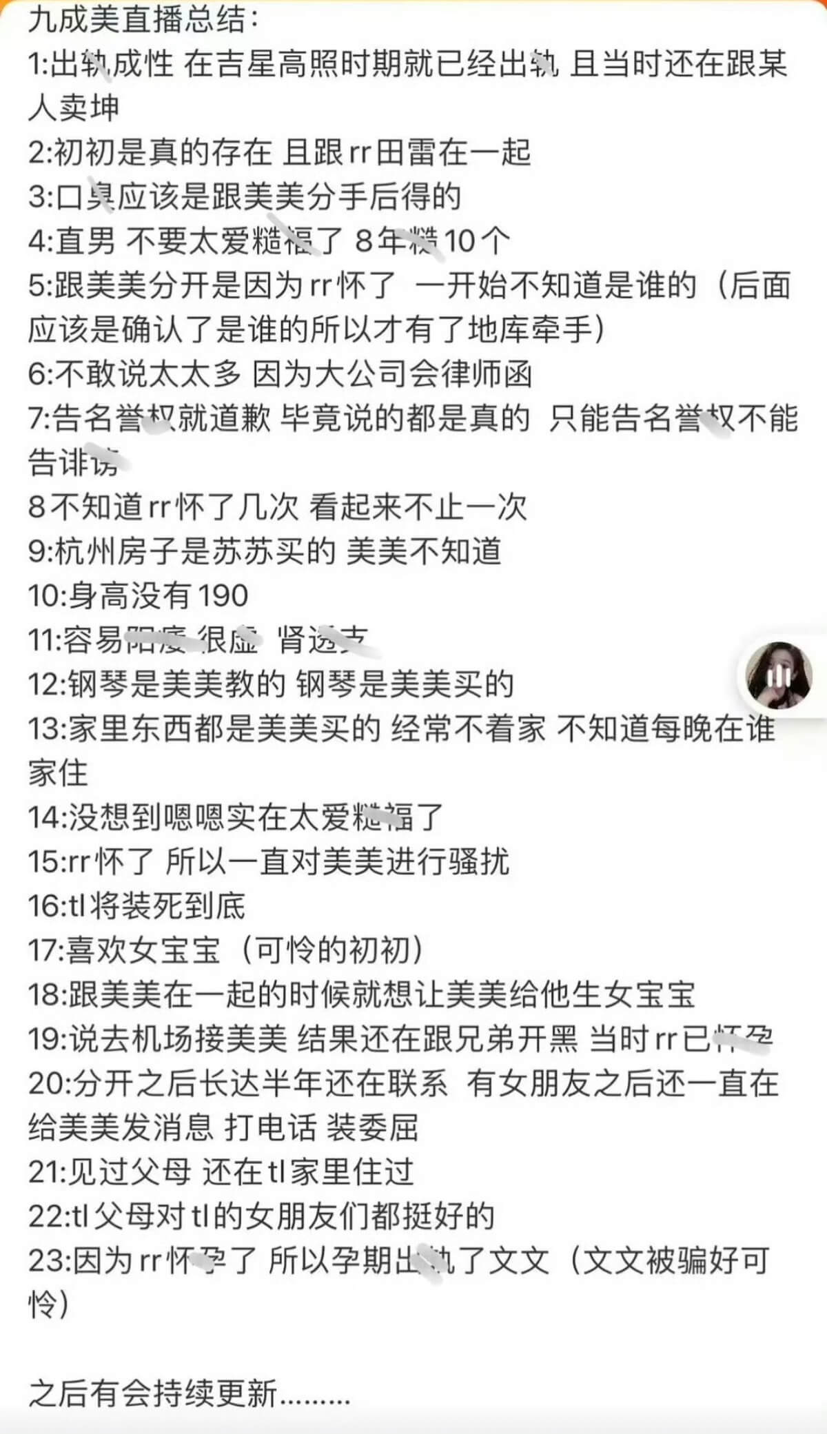 來看看,網友整理的九成美爆料總結!「tl」代表田雷,也就是田栩寧本名,「rr」代表若若,也就是網傳現嫂子;而「初初」則是網傳田栩寧孩子的乳名👇