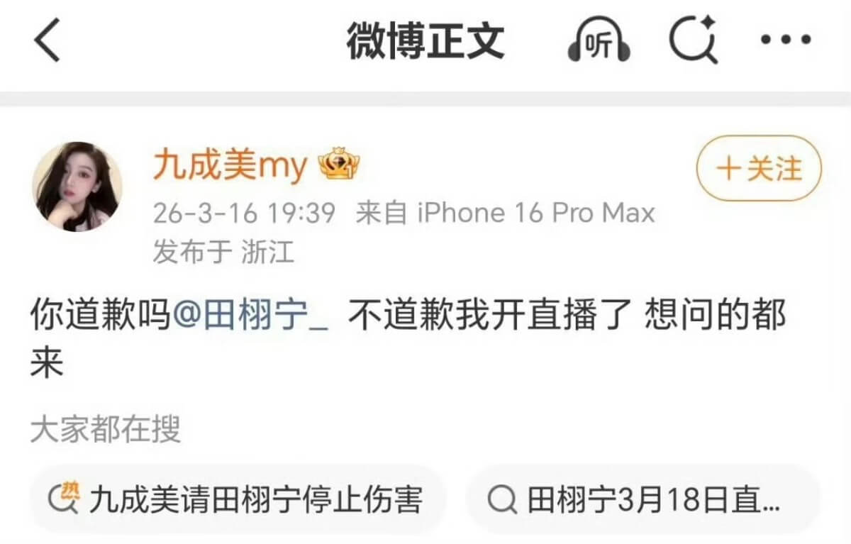 就是說,這幾天內娛的熱搜榜,都被田栩寧網紅前女友「九成美」刷屏,而她16號晚上喊話田栩寧道歉,否則就要開直播爆料👇