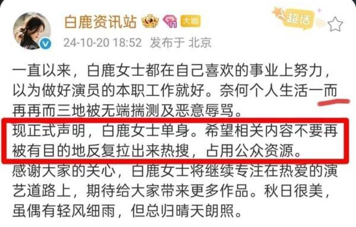 一直到了24年,白鹿方才發了單身聲明,被指兩人已經分手👇