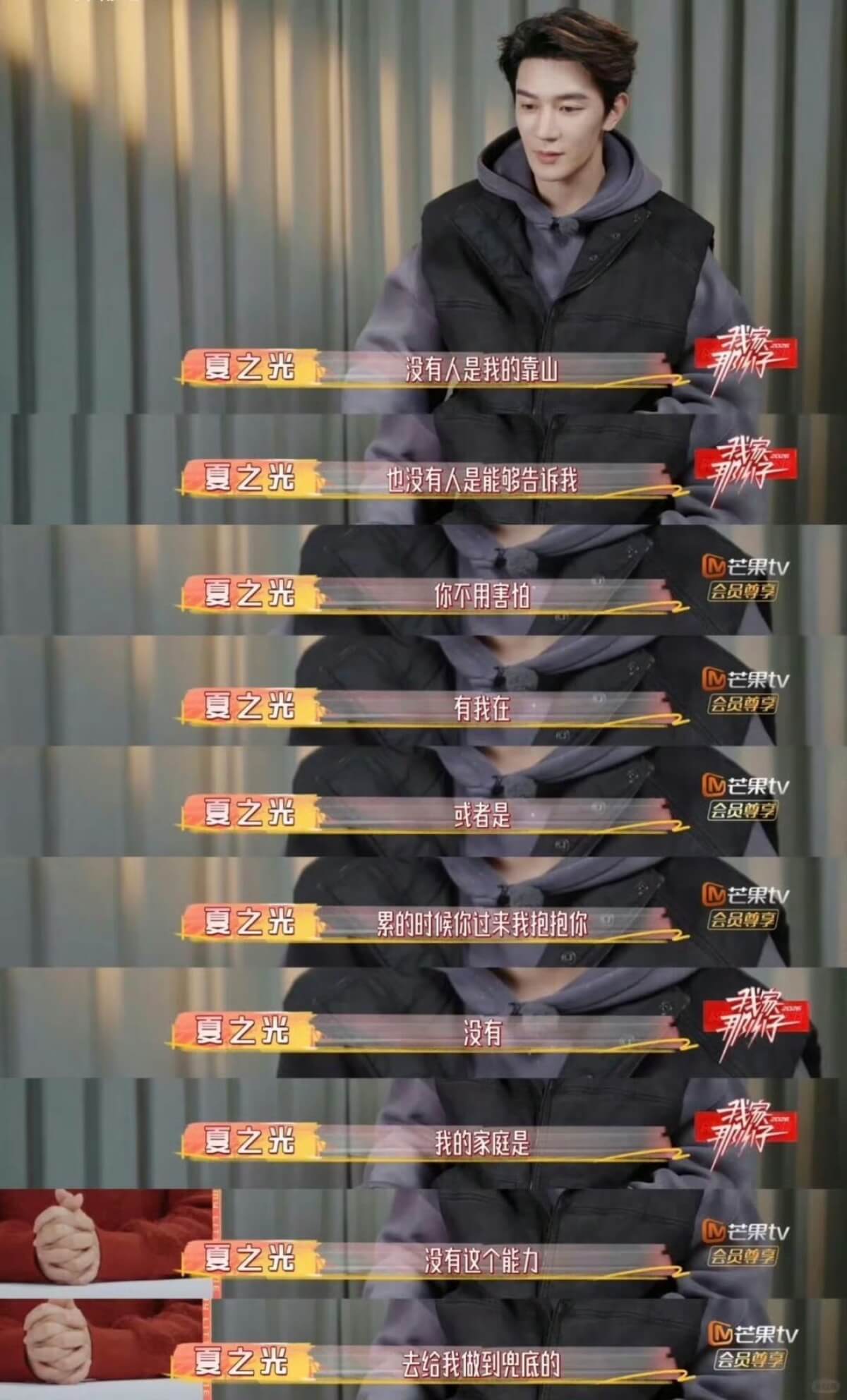 在和父母聊天時,夏之光提到了自己曾因為剛出道,每個月只有3千塊錢,未滿16歲的他又要準備高考又要做練習生又要上節目,微薄的收入根本不能支撐他在北京的生活,最窮的時候連電話費都交不起,他對父母坦言,當時的自己「孤立無援」👇