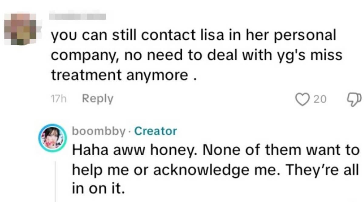 當有網友留言,她可以尋求LISA個人公司尋求幫助,Bekuh BOOM直言:「他們中沒有任何一個人照顧過我,全都是一夥的(They were all in on it)。」
