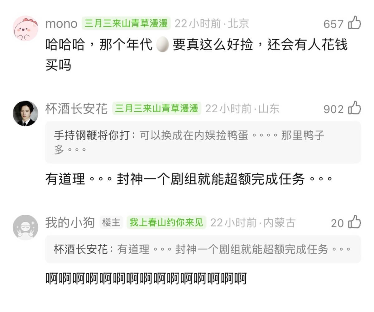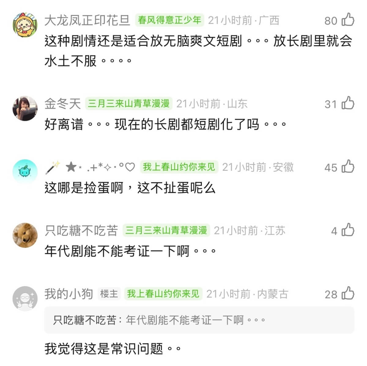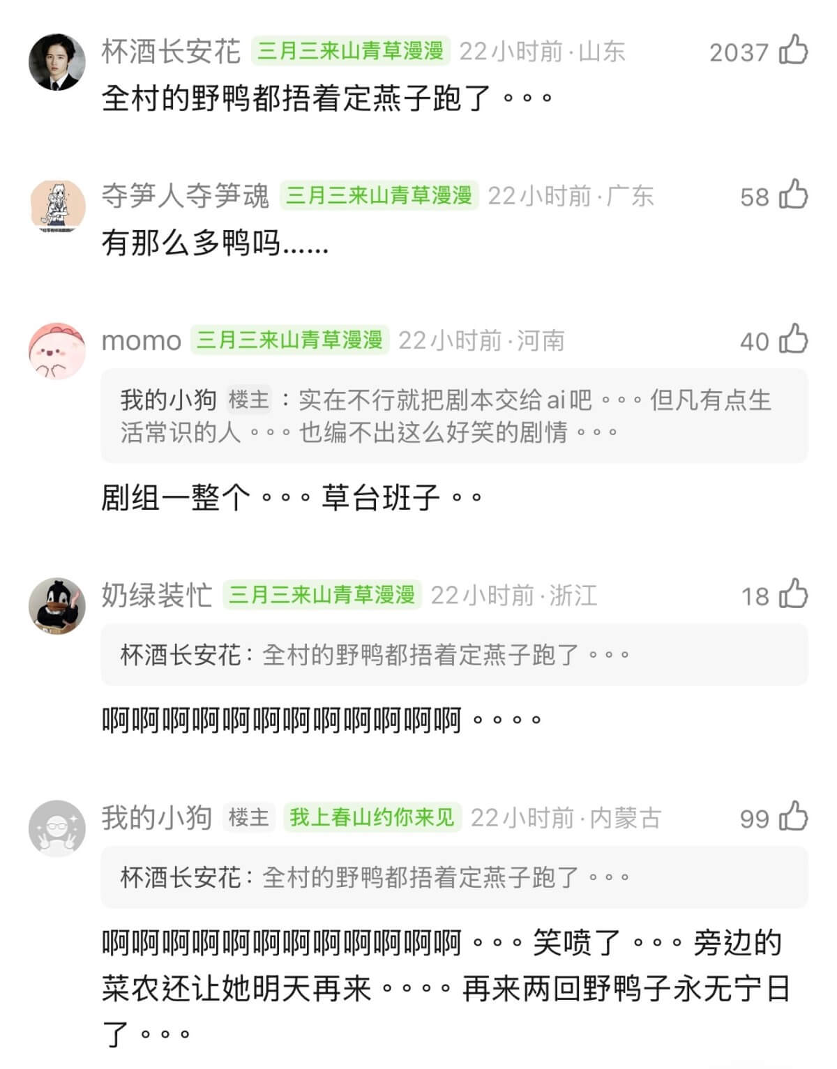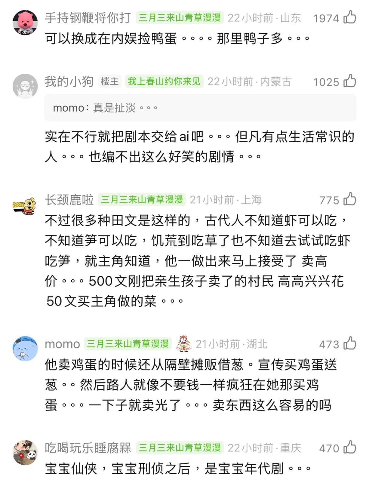 就是說,周也他媽一天撿了七十多個鴨蛋!網友問題是:「全村的野鴨蛋,村民都不知道撿,就留着周也她媽去撿,然後讓她拿去賣錢…」編劇編的時候,沒覺得哪裏不符合邏輯嗎?