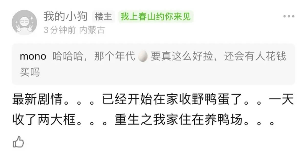 最新劇情,已經發展到在家收野鴨蛋了,網友戲稱這是:「重生之我家住在養鴨場…」