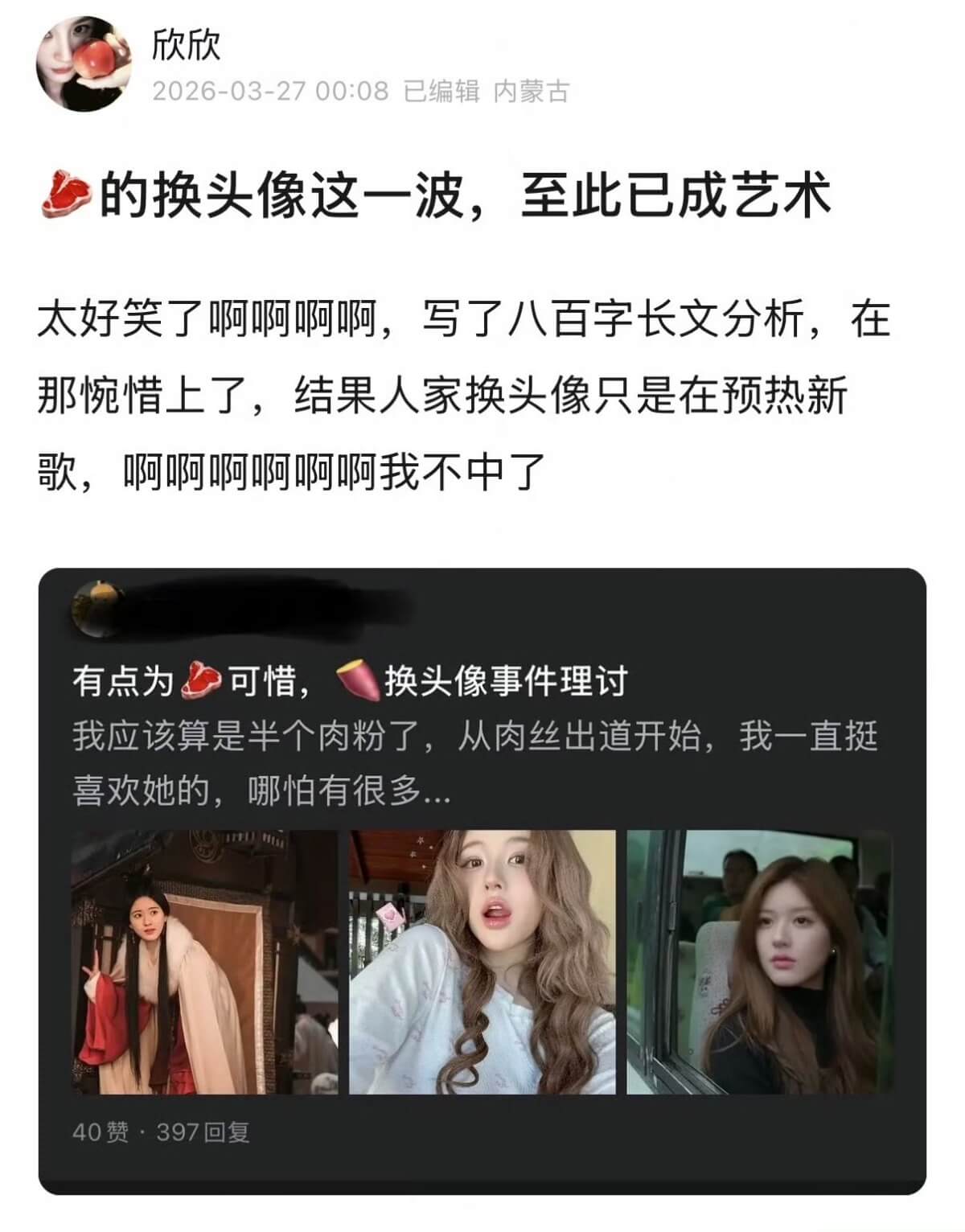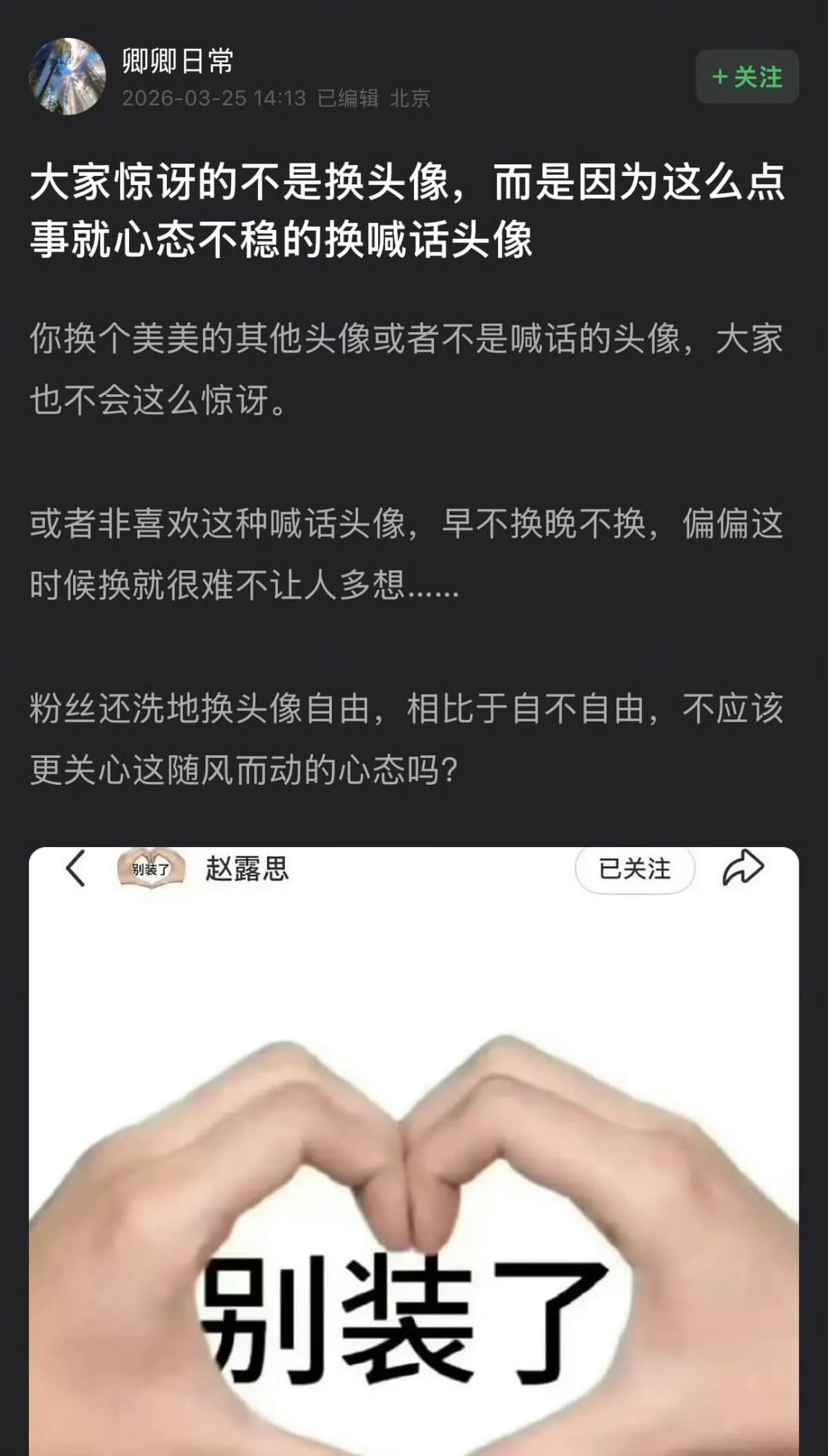 不是,這真的是太爽文女主了吧!!!是噠,趙露思日前不但大動作換頭像,還發帖「別裝了」,被指疑似在喊話虞書欣,引起了高度關注,前因後果看這裡👇