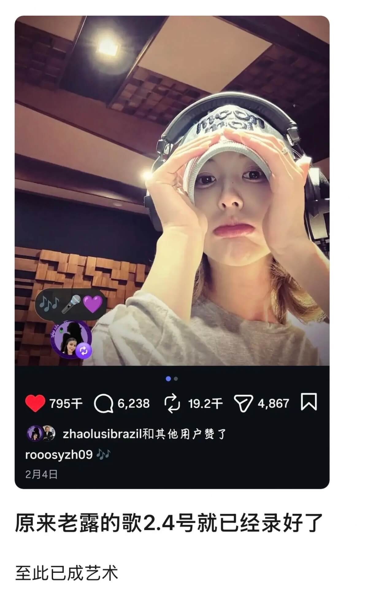 而且網友發現,趙露思早在2月初就已經在錄新歌了,不存在特地反轉的意思👇