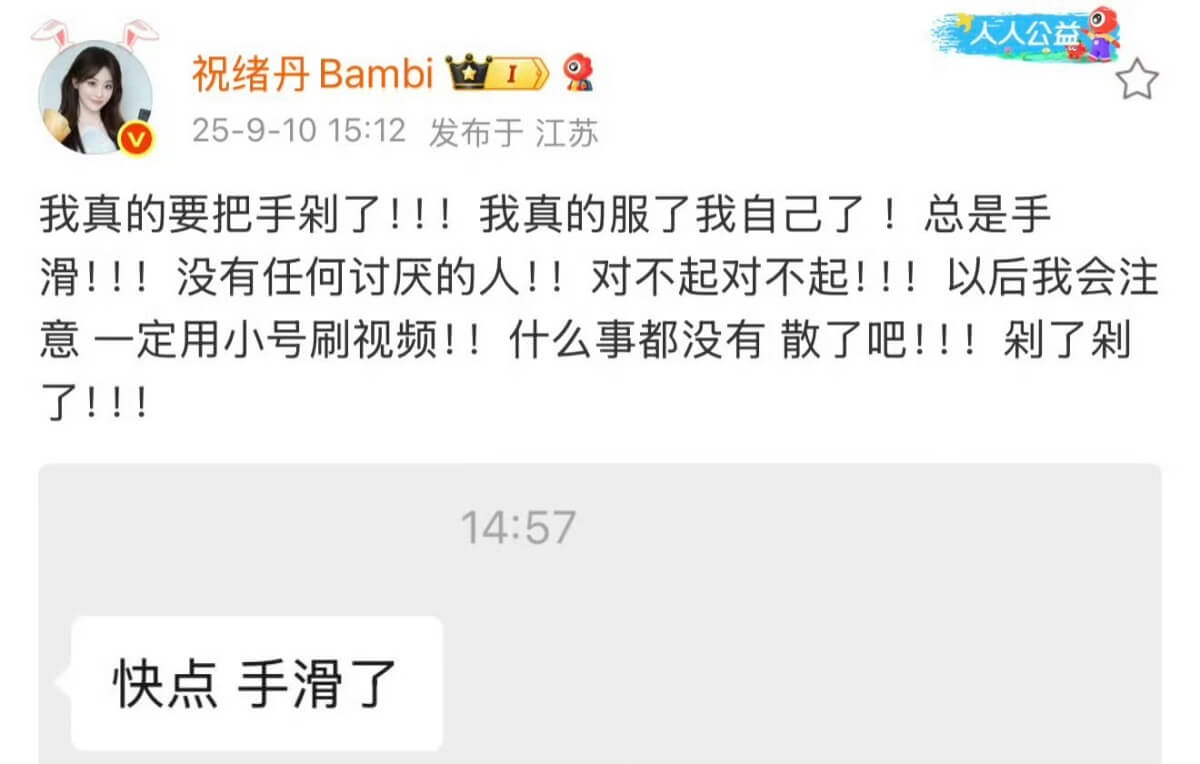 當時祝緒丹還特別發文解釋自己是手滑,但她這舉動,被粉絲炮轟是進一步擴大爭議👇