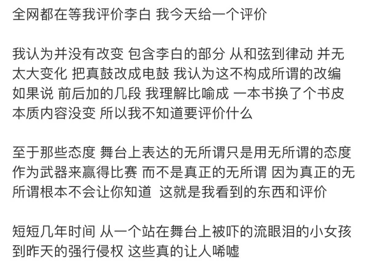 5. 點評單依純翻唱的《李白》不構成所謂的改編,舞台上只是用無所謂的態度贏得比賽。