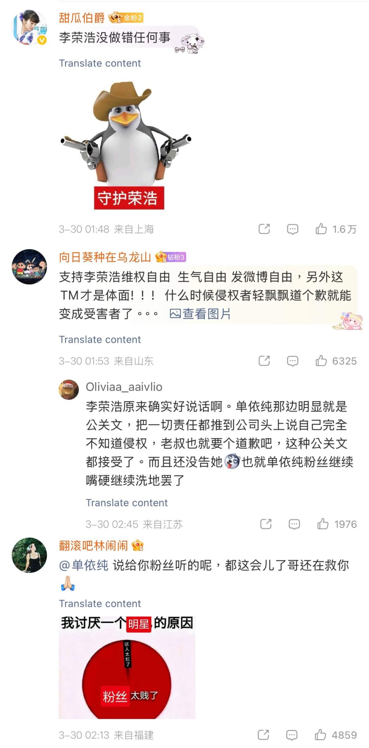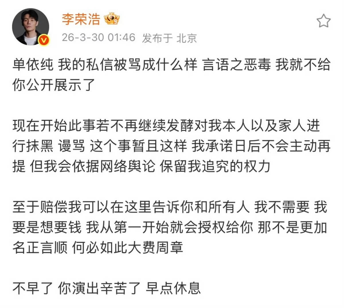 李榮浩則在38分鐘後火速回應,表示只要後續他和家人不再遭到單依純粉絲的惡意謾罵,他將不會主動再提,並回絕了單依純提議的版權費賠償。不過針對網路謾罵,他強調將保留追究的權利。