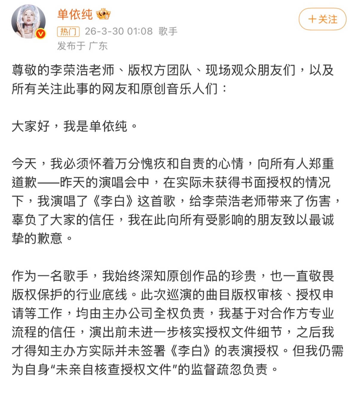 單依純再次發長文向李榮浩道歉,以下為省流版。
