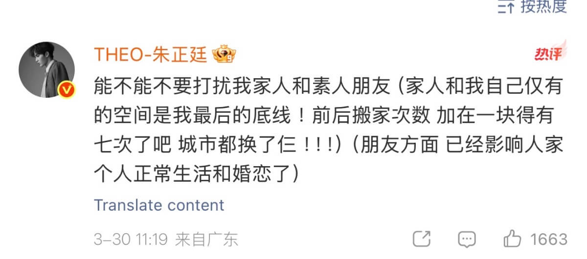 而朱正廷本人也在評論區回應,表示已經搬過3座城市7次家,私生活已經被嚴重打擾!