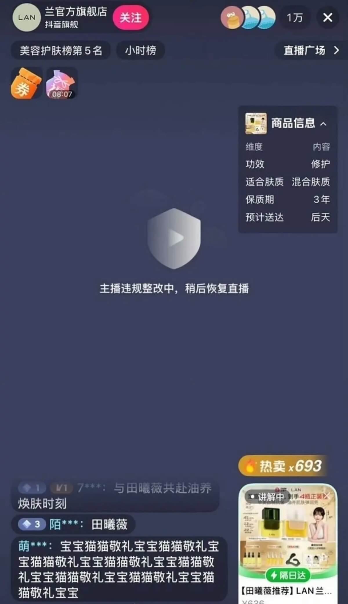 沒想到這樣的形象,進行直播時居然也遭到了封禁?是噠,有網友發現,田曦薇近日的一場代言直播,才播出不久就被封了👇