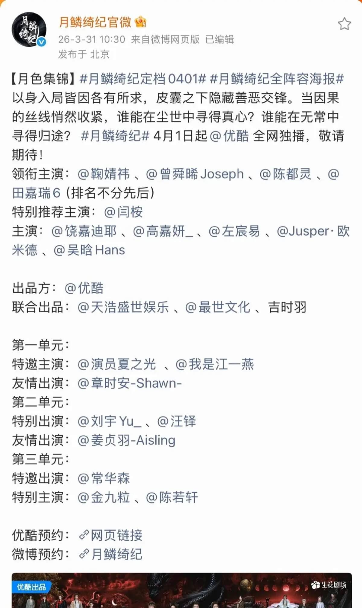 真的被刪除了?是噠,鞠婧禕新劇《月鱗綺紀》定檔4月1日,結果沒想到一官宣定檔,鞠婧禕就爆出了偷漏稅爭議,來看工作室回應👇