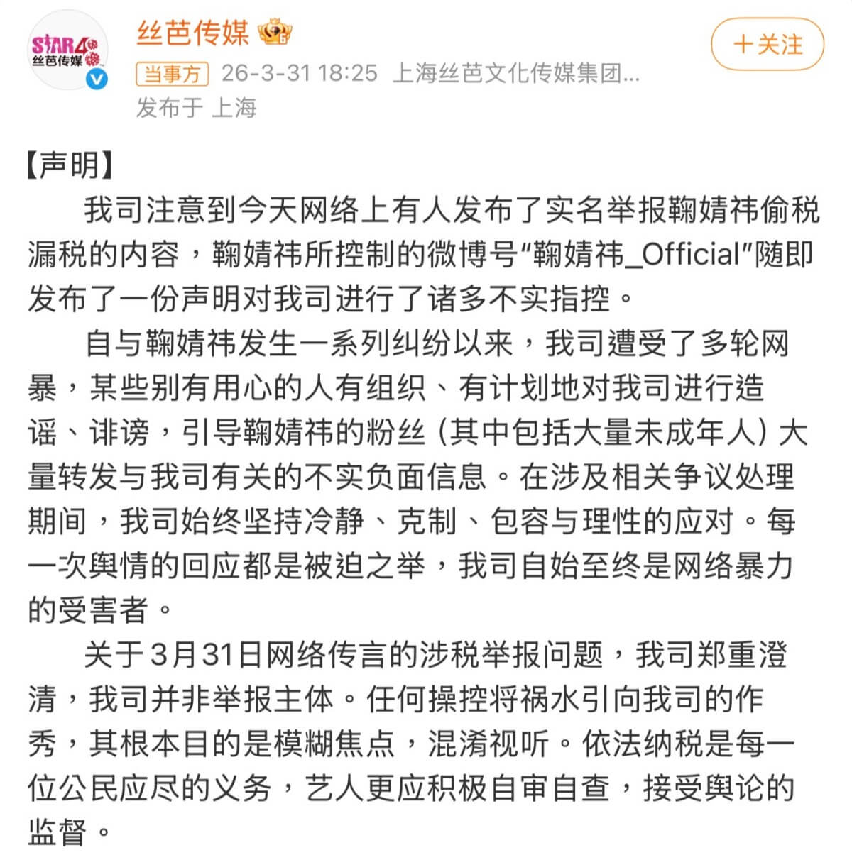 熱搜爆了!被指實名舉報偷漏稅!絲芭傳媒三問鞠婧禕自稱「網報受害者」!