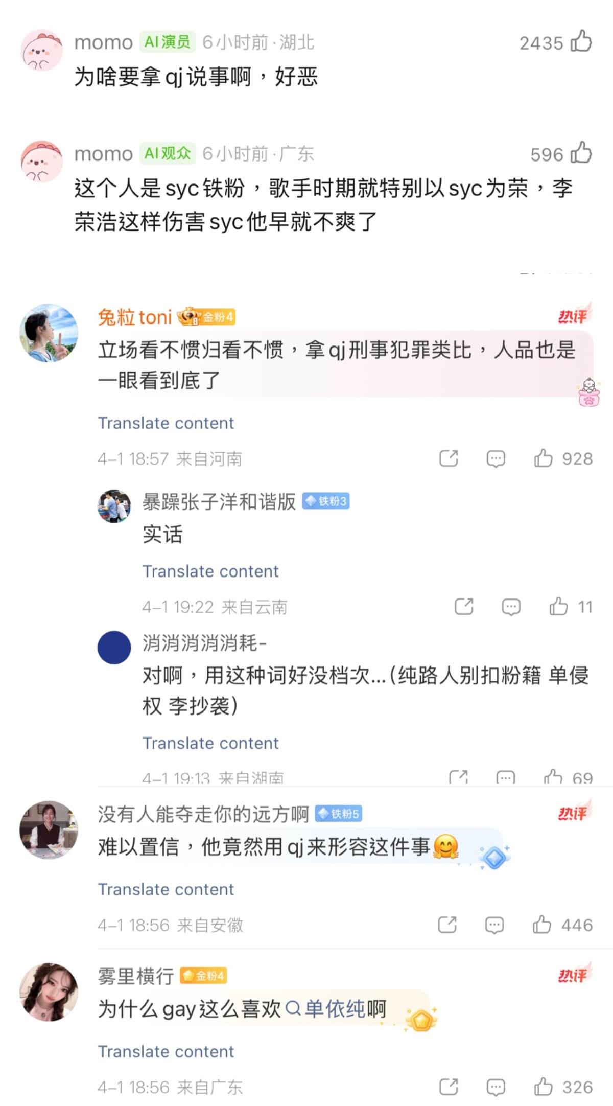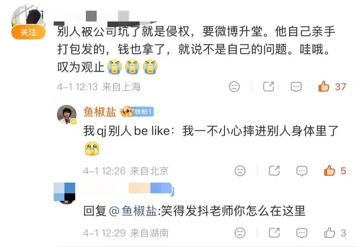 在網友吐槽李榮浩否認抄襲的評論下,魚椒鹽留言表示:「我qj(強姦)別人be like:我一不小心摔進別人身體裡了」