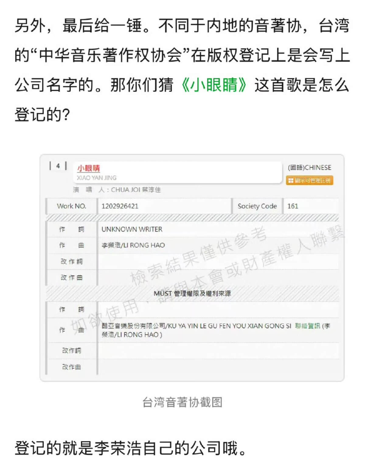 但是台灣地區音樂著作權協會的登記資料清清楚楚寫著,《小眼睛》的版權管理方是李榮浩自己的公司“酷亞音樂”,商用授權直接找他本人。