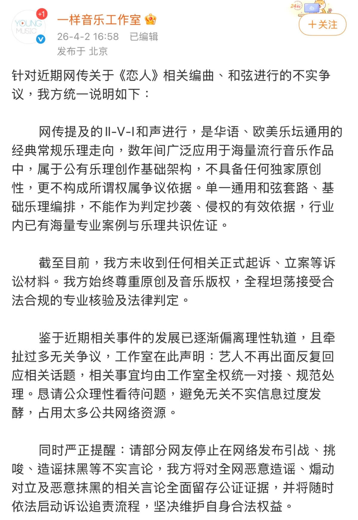 李榮浩工作室第一時間發文回應,否認抄襲,並解釋了公有樂理的情況。