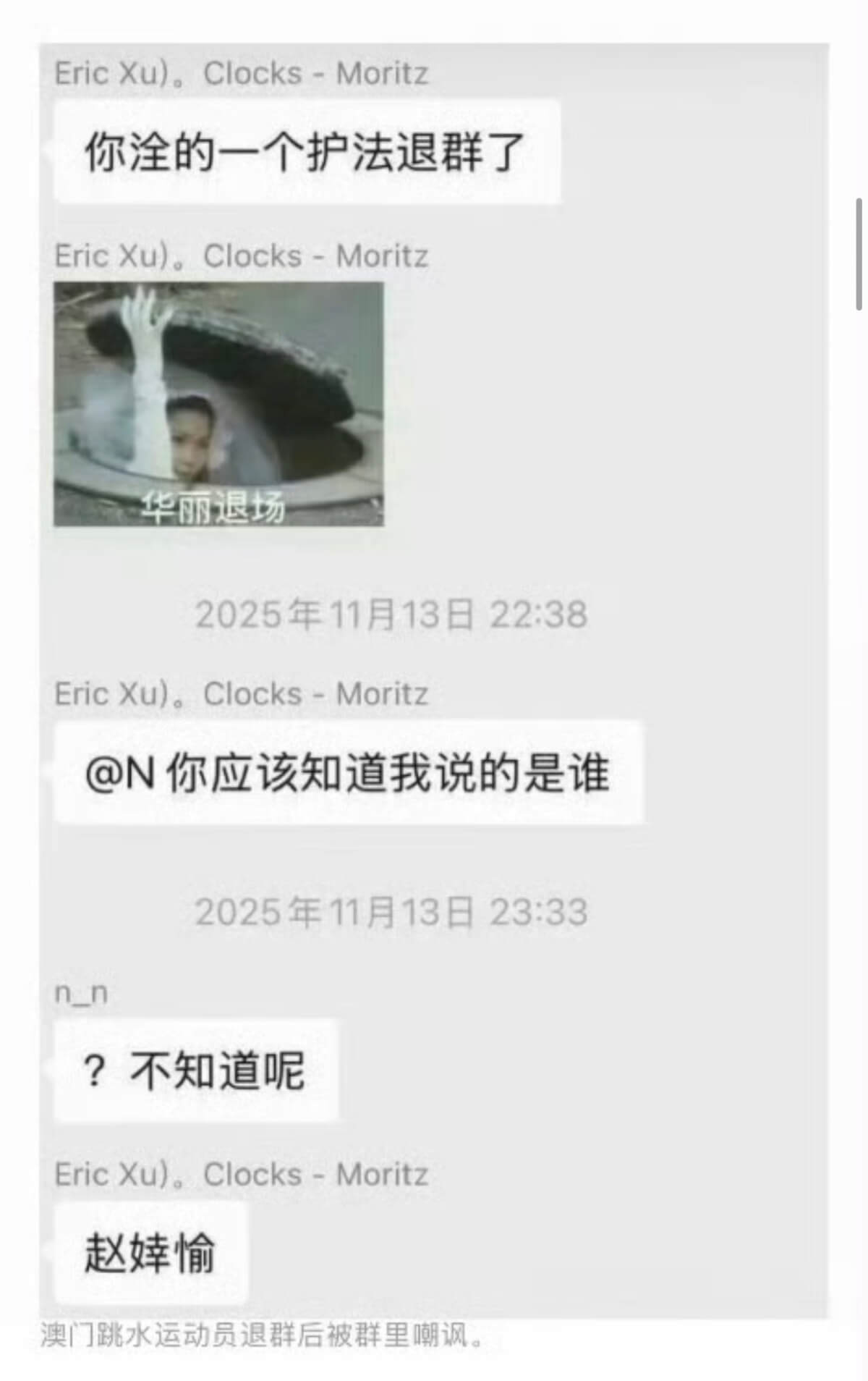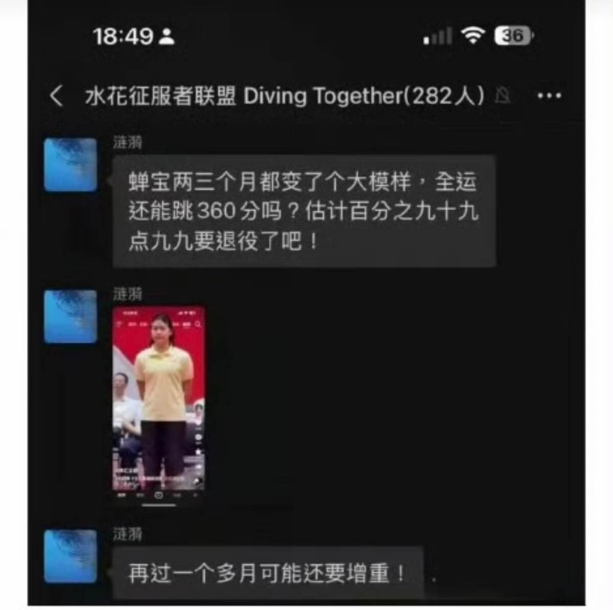 網傳澳門隊的一位跳水隊運動員進群,看到群裏有人罵全紅嬋後就退群,結果還被群裡的人罵是全紅嬋的護法。