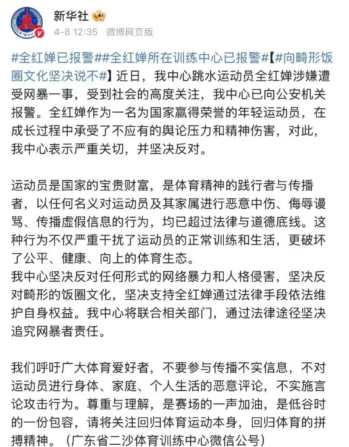 全紅嬋報警了!是噠,全紅嬋所在的訓練中心,在8號發公告強調網暴嚴重干擾訓練生活,破壞體育生態,將聯合相關部門追究網暴者法律責任。而國家體育總局游泳中心也已與廣東省體育局聯合嚴查處置,堅決抵制畸形”飯圈”文化侵蝕,一經查實嚴肅處理。