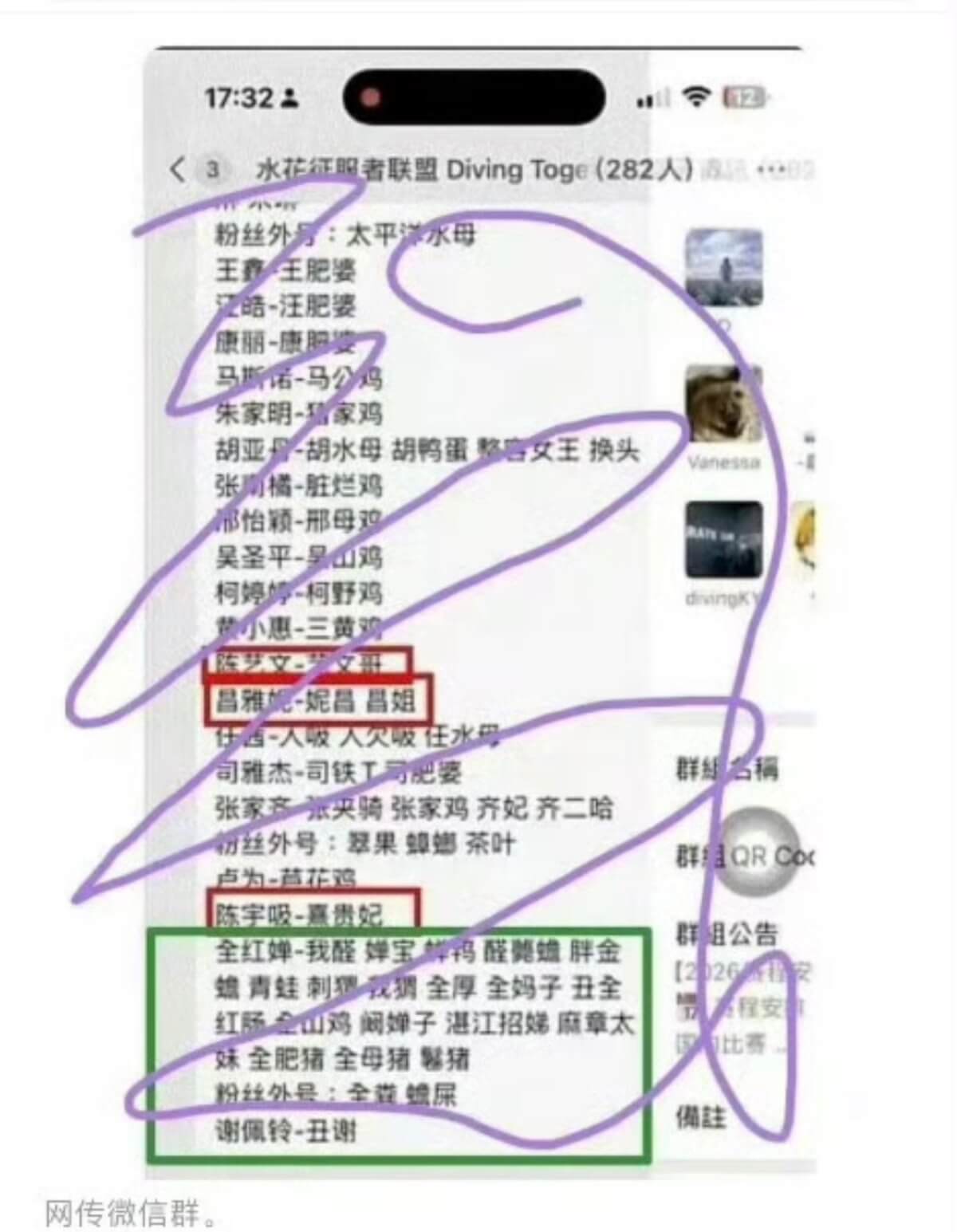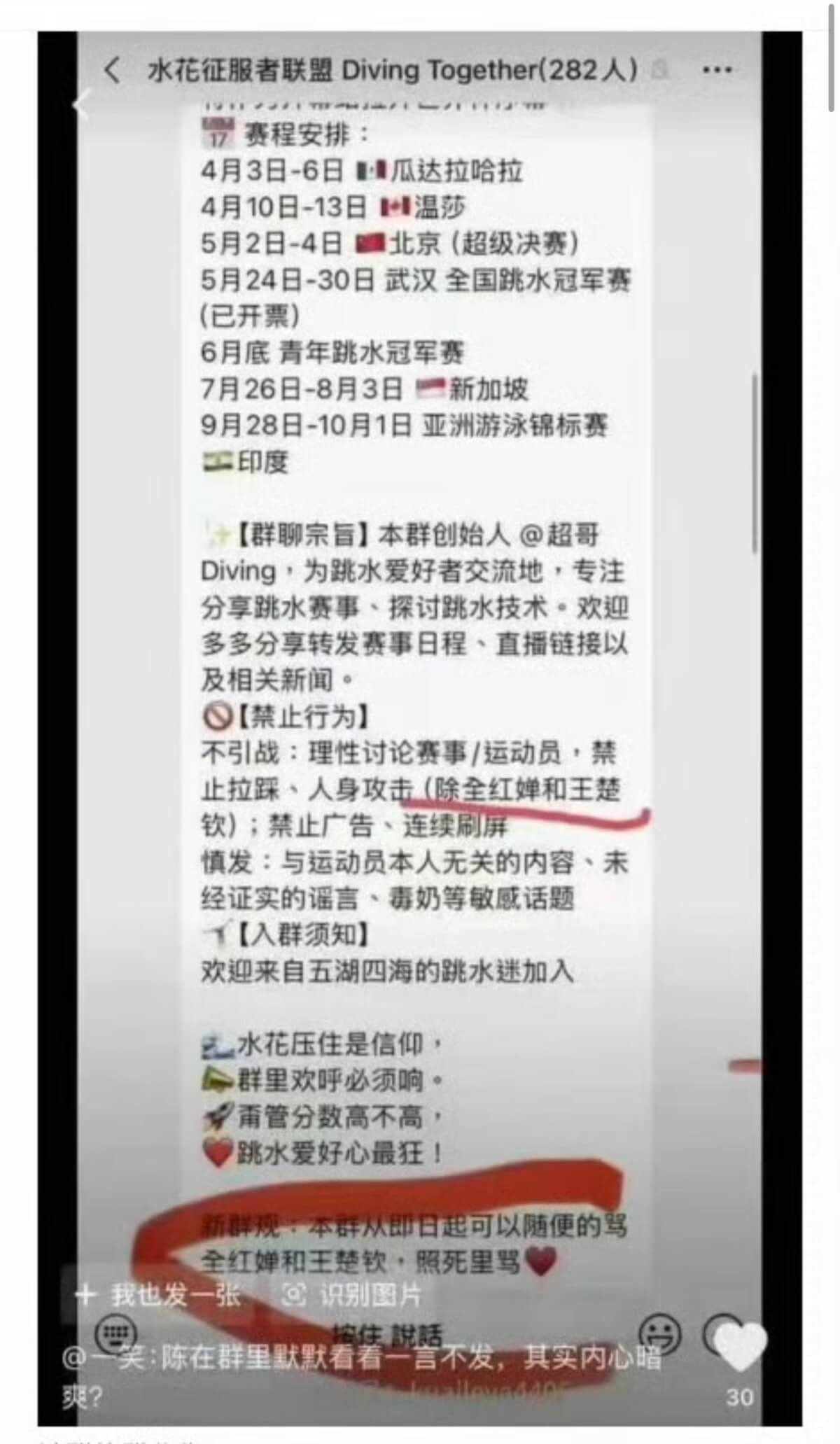 然而在近期,有一個名字爲「水花征服者聯盟」的微信群(282人),被曝光長期針對全紅嬋進行人身攻擊,群公告明確標註「禁止攻擊其他運動員(全紅嬋和乒乓球員王楚欽除外),並默許群成員對全紅嬋使用大量侮辱性外號(如“全母豬”、“全肥豬”)。