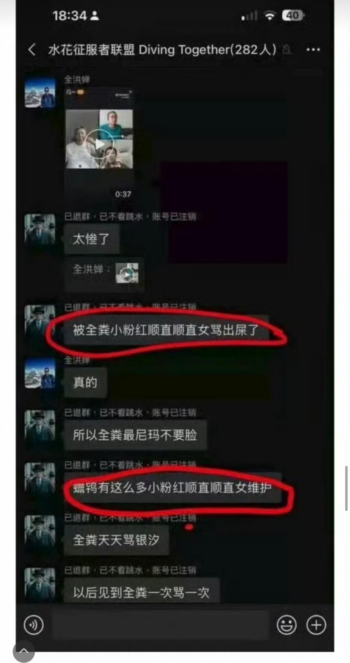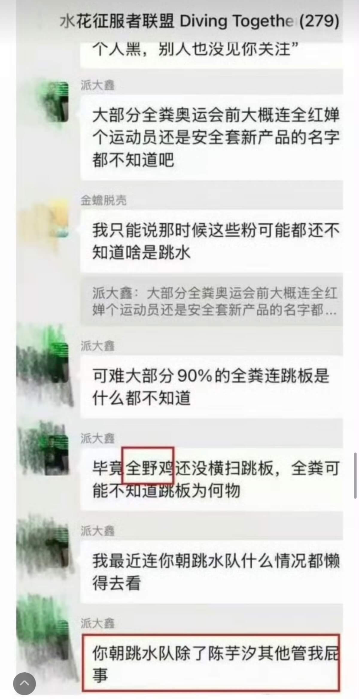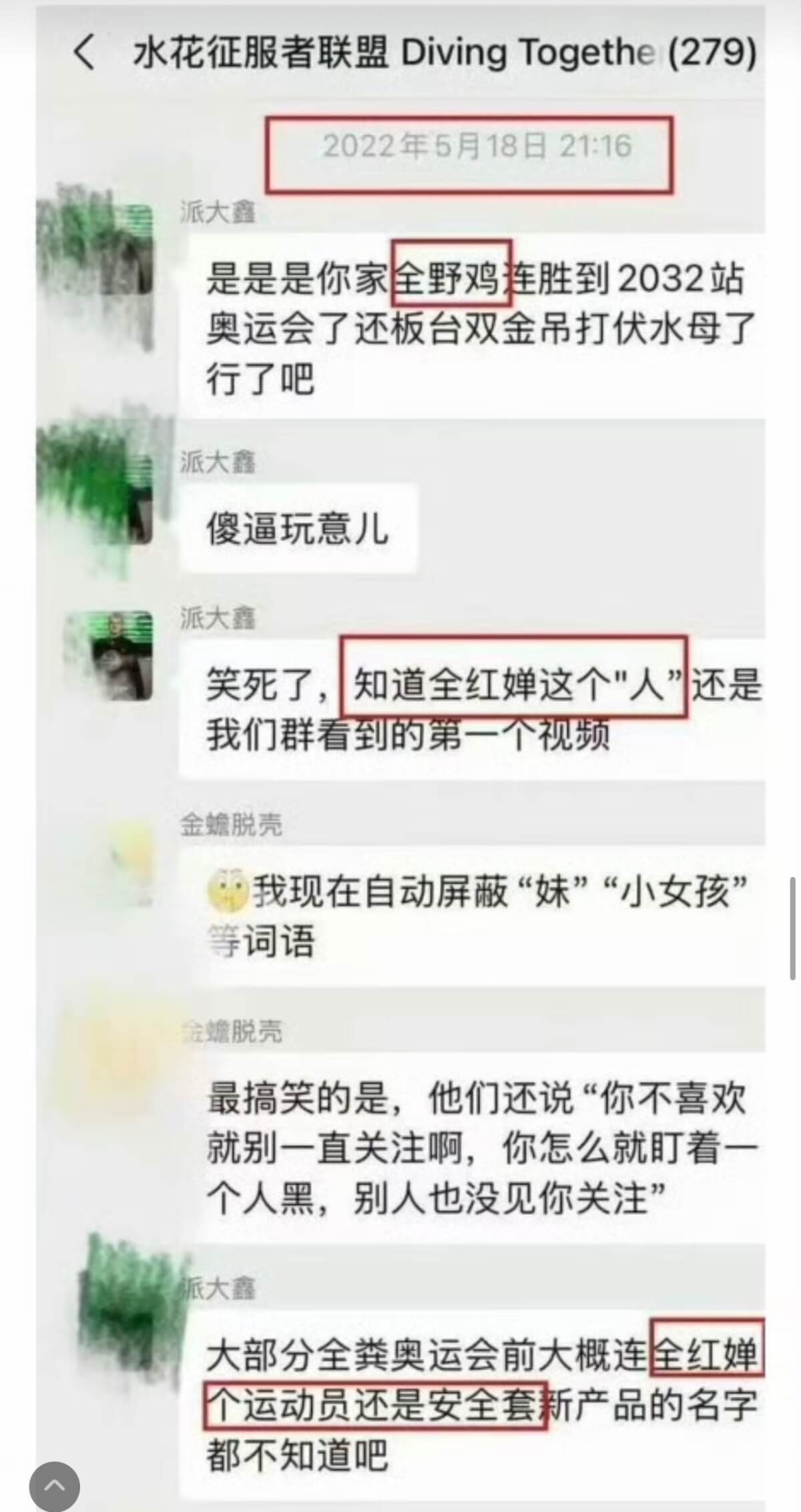 然而在近期,有一個名字爲「水花征服者聯盟」的微信群(282人),被曝光長期針對全紅嬋進行人身攻擊,群公告明確標註「禁止攻擊其他運動員(全紅嬋和乒乓球員王楚欽除外),並默許群成員對全紅嬋使用大量侮辱性外號(如“全母豬”、“全肥豬”)。