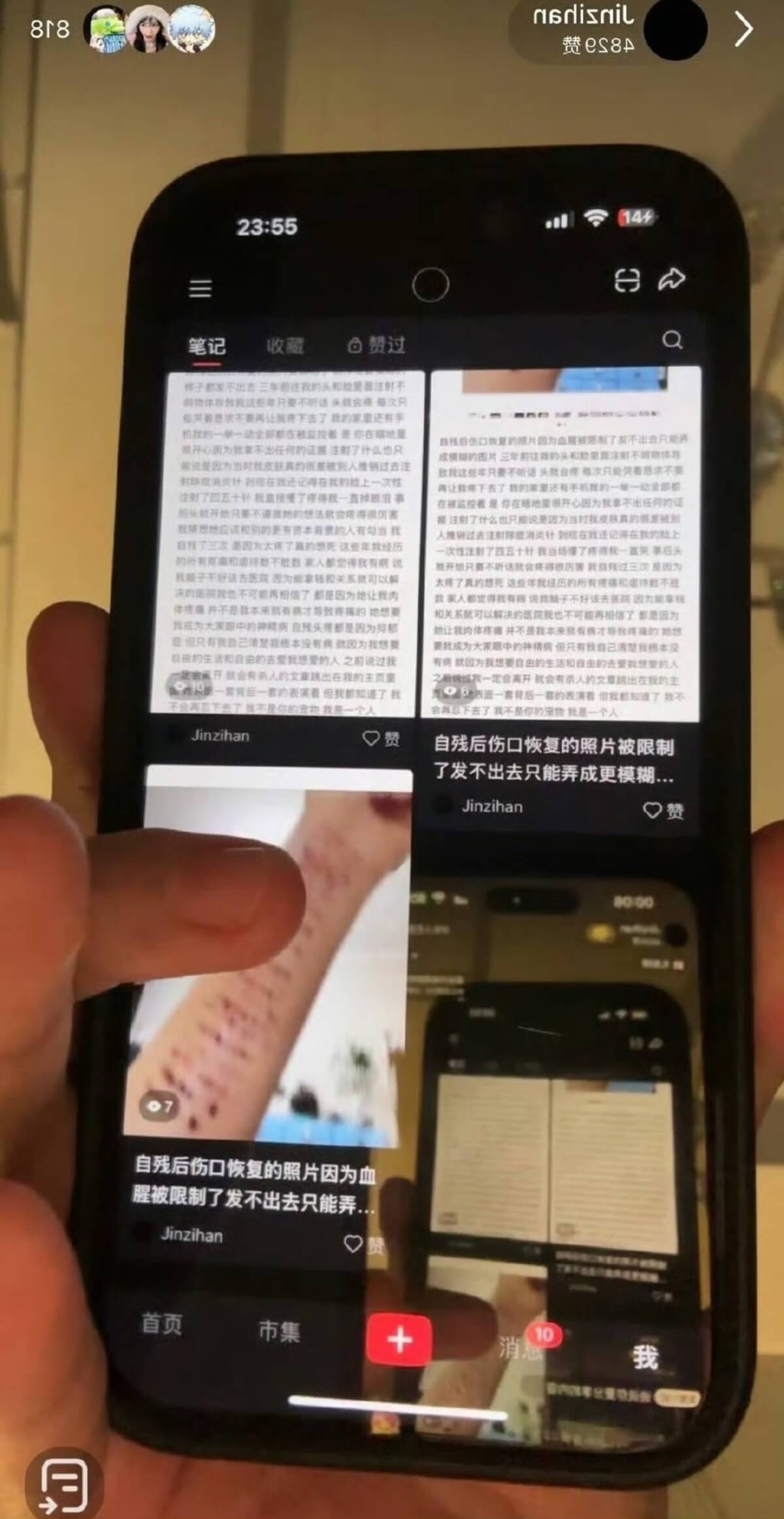 還在鏡頭前曬出自己的手臂的照片,上面都是自殘的傷口👇