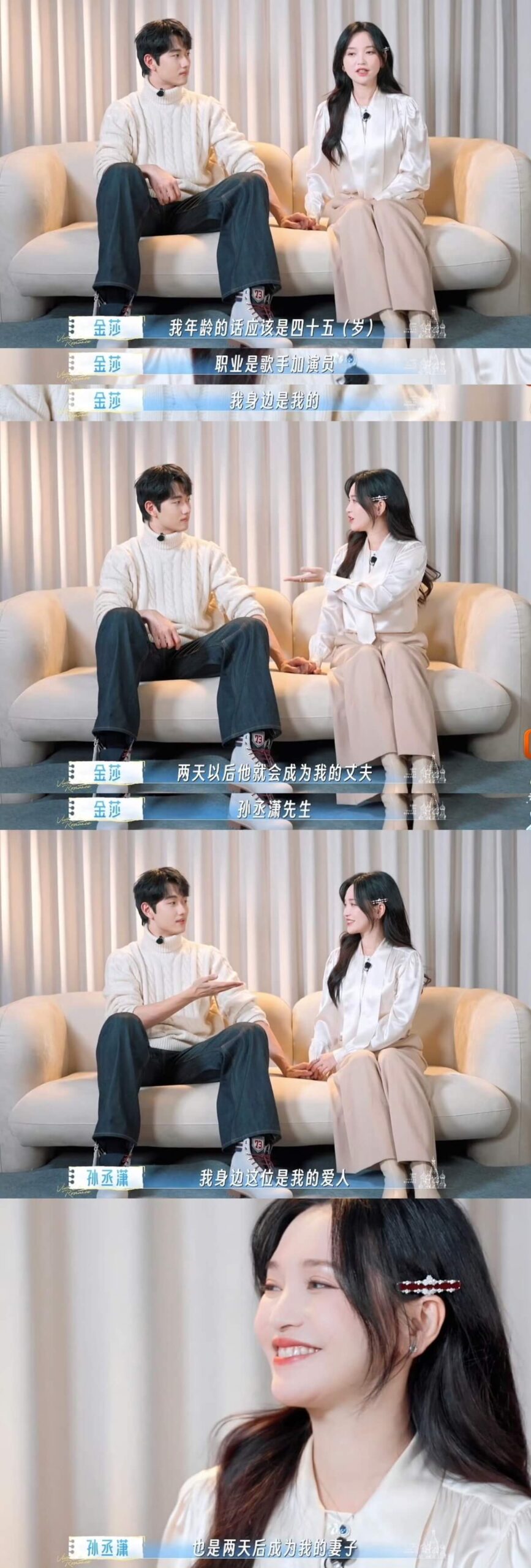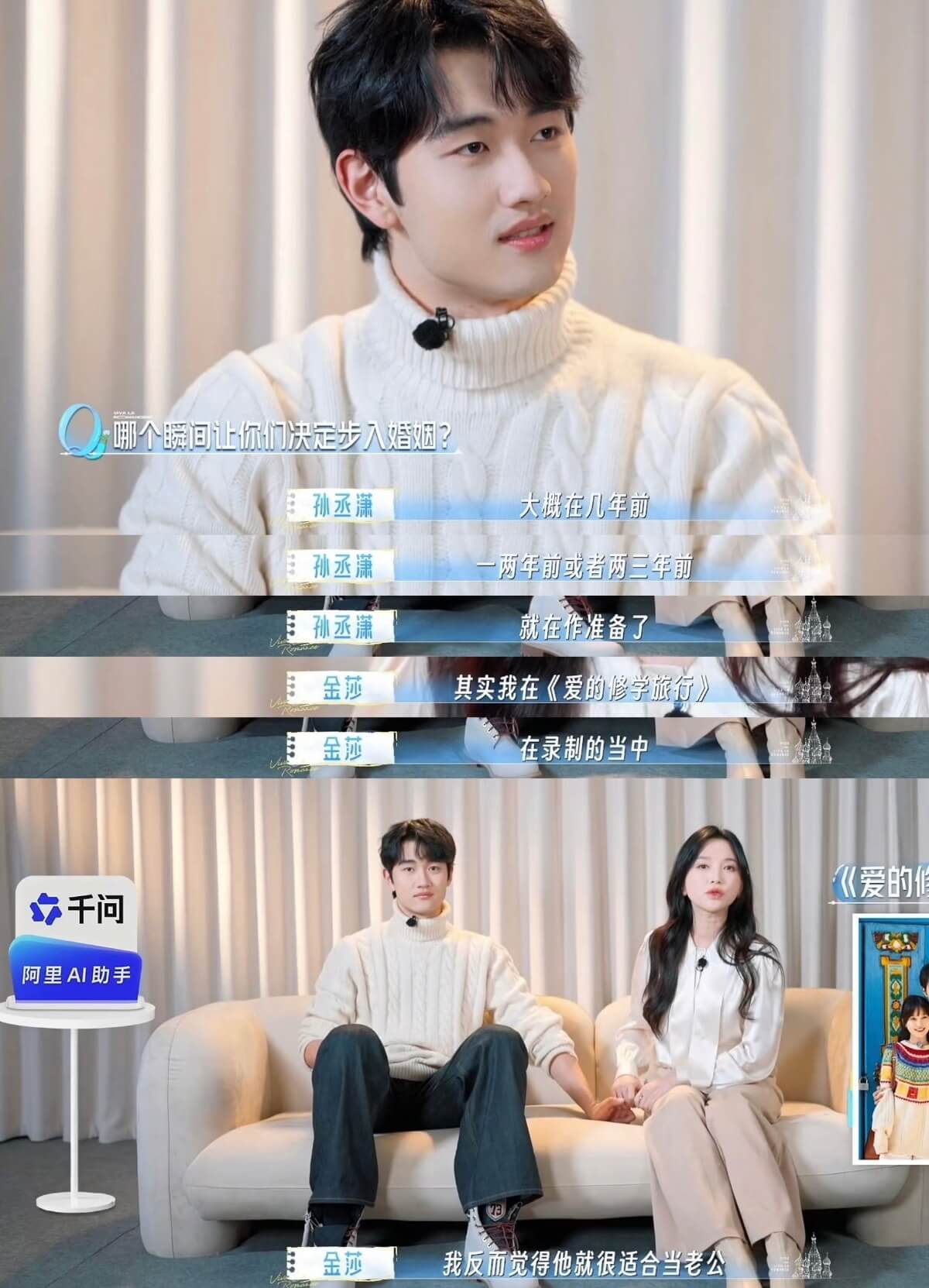 而在節目中,金莎也公開了自己選擇嫁給孫丞瀟的原因,第一是他一直都很穩重,之前全網質疑他和金莎戀愛的動機,懷疑他是想藉著對方進入演藝圈時,他也依然不被流言蜚語困擾,堅定的對自己好!