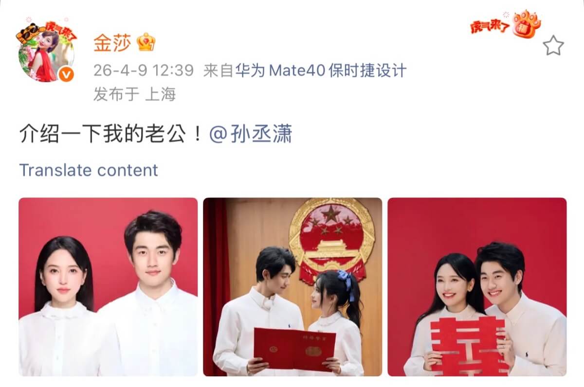 而在9號這天,金莎率先公開和孫丞瀟的領證照,官宣正式結婚啦!