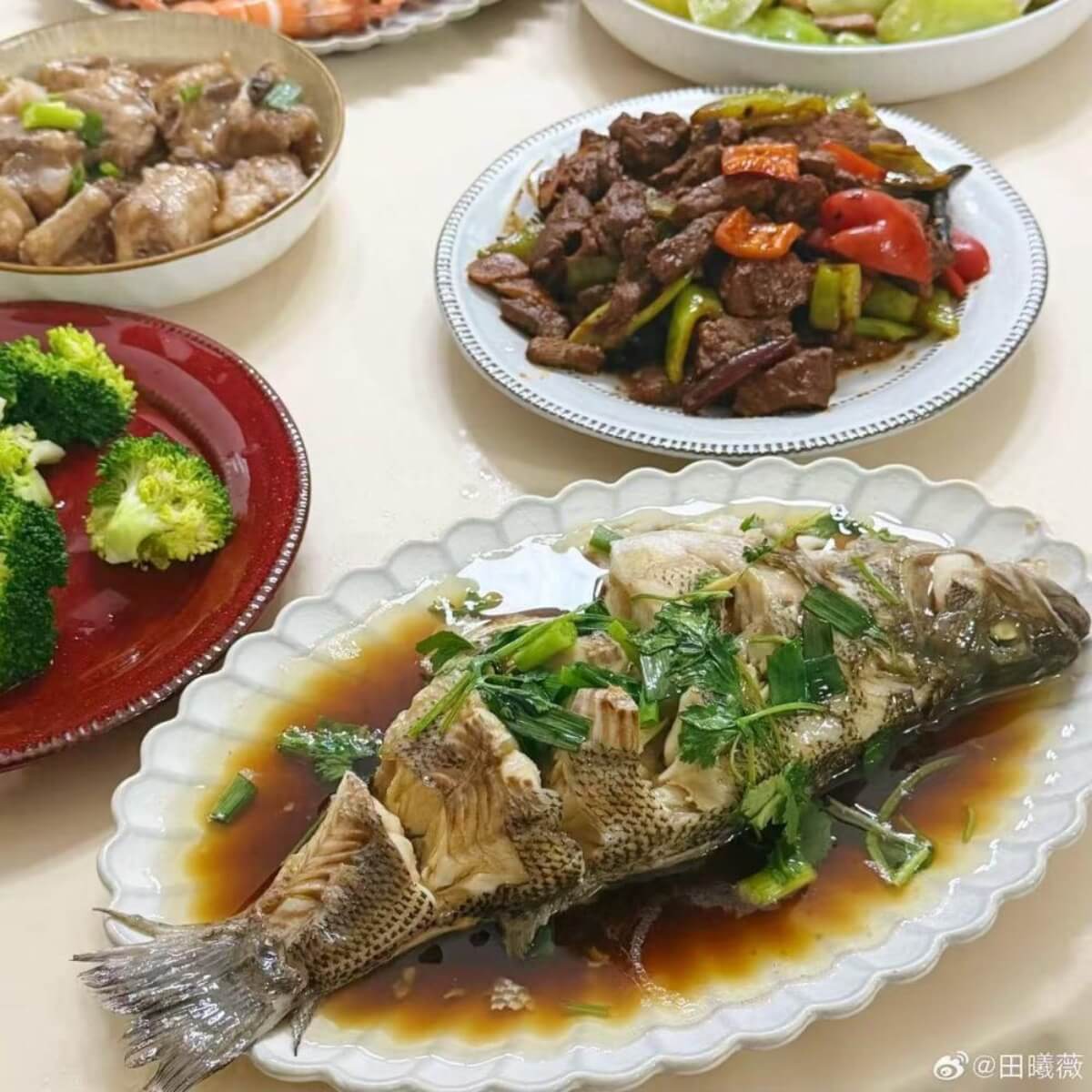 這幾道菜和田曦薇發的排骨蝦和魚全都對上了,網友分析表示每個人擅長的菜就那幾種願意拿出來做。