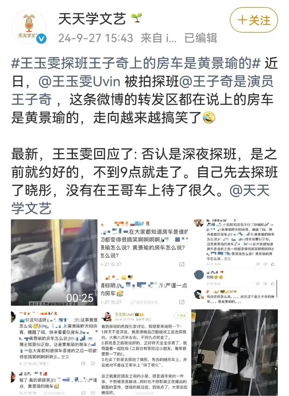 另外,有網友扒出,早在2024年,王玉雯就被拍到上了黃景瑜的房車,但當時說她應該是想探班同劇的王子奇,只不過上錯了房車👇
