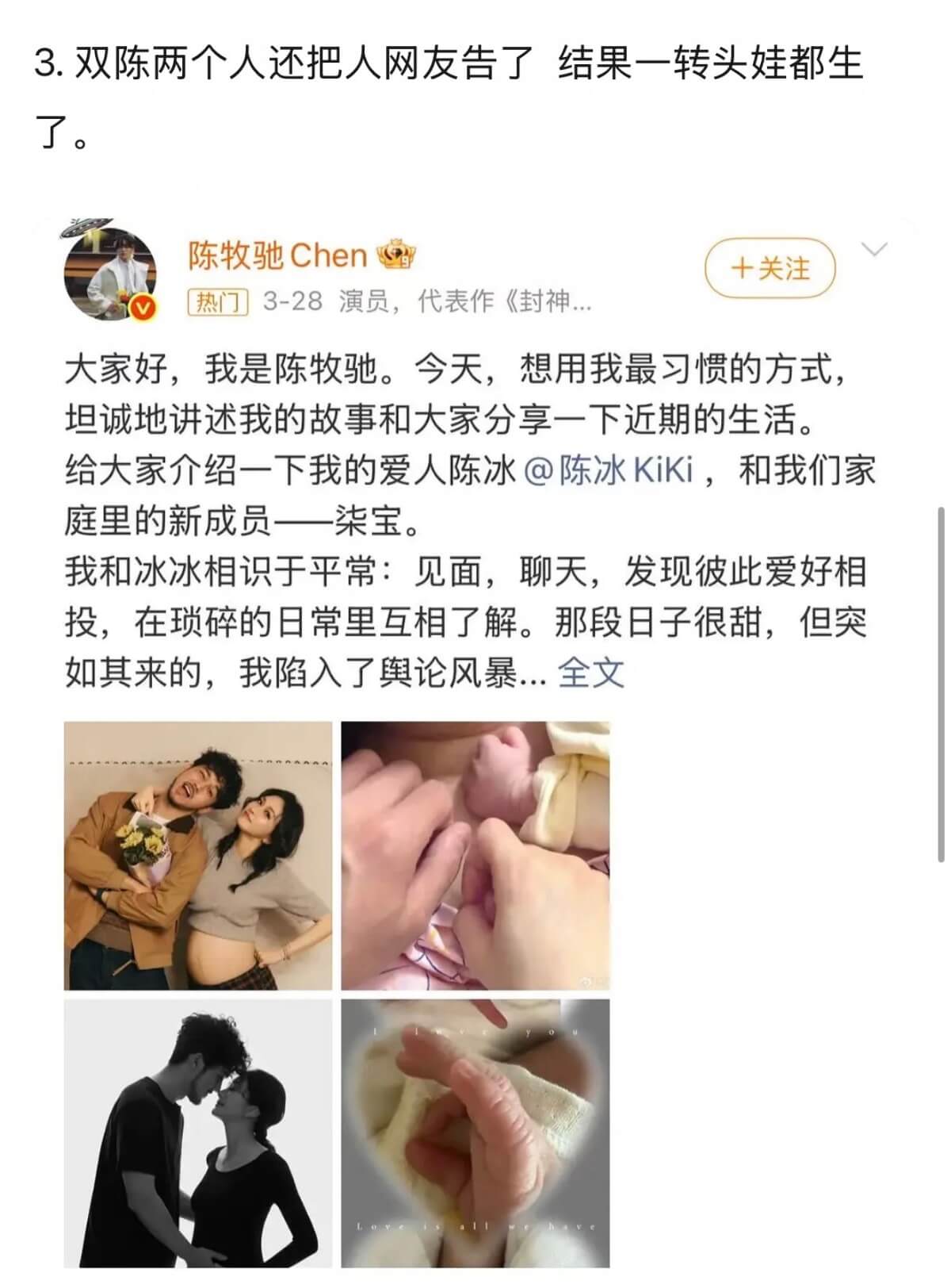 第三就是告了網友毀謗,結果官宣結婚生子的陳牧馳和陳冰👇