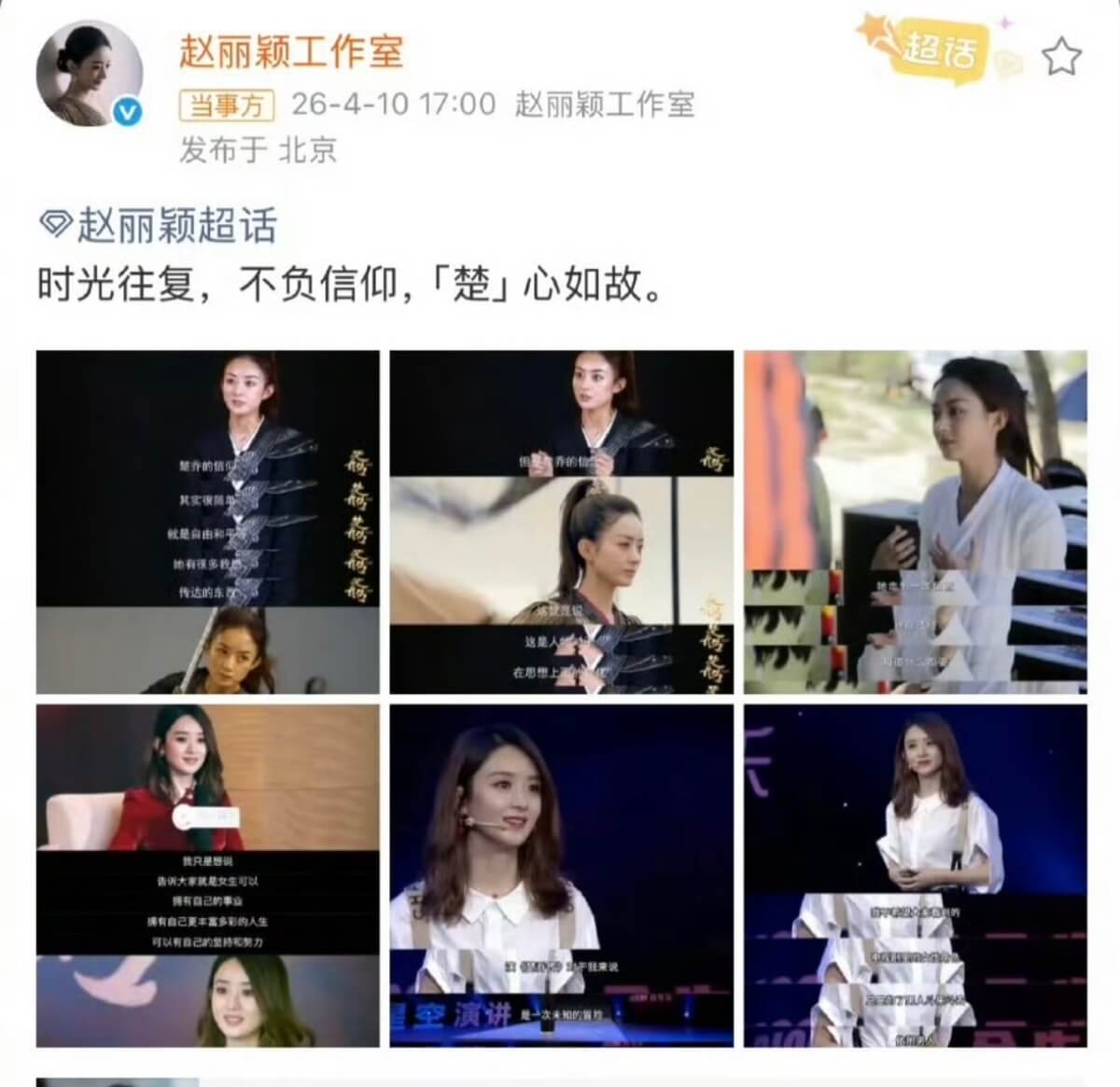 而趙麗穎工作室也發文,分享了趙麗穎《楚喬傳》時期的採訪,並配文:「時光往復,不負信仰,「楚」心如故。」被指暗暗切割,拒絕被續集捆綁!