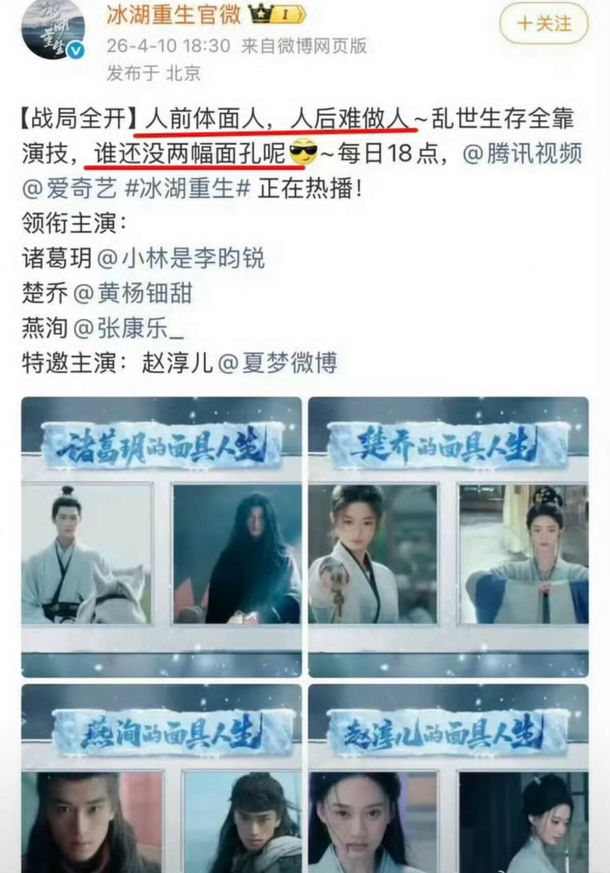 沒想到隨後《冰湖重生》官微也發文,但文字十分有意思:「人前體面人,人後難做人,誰還沒兩幅面孔呢?」