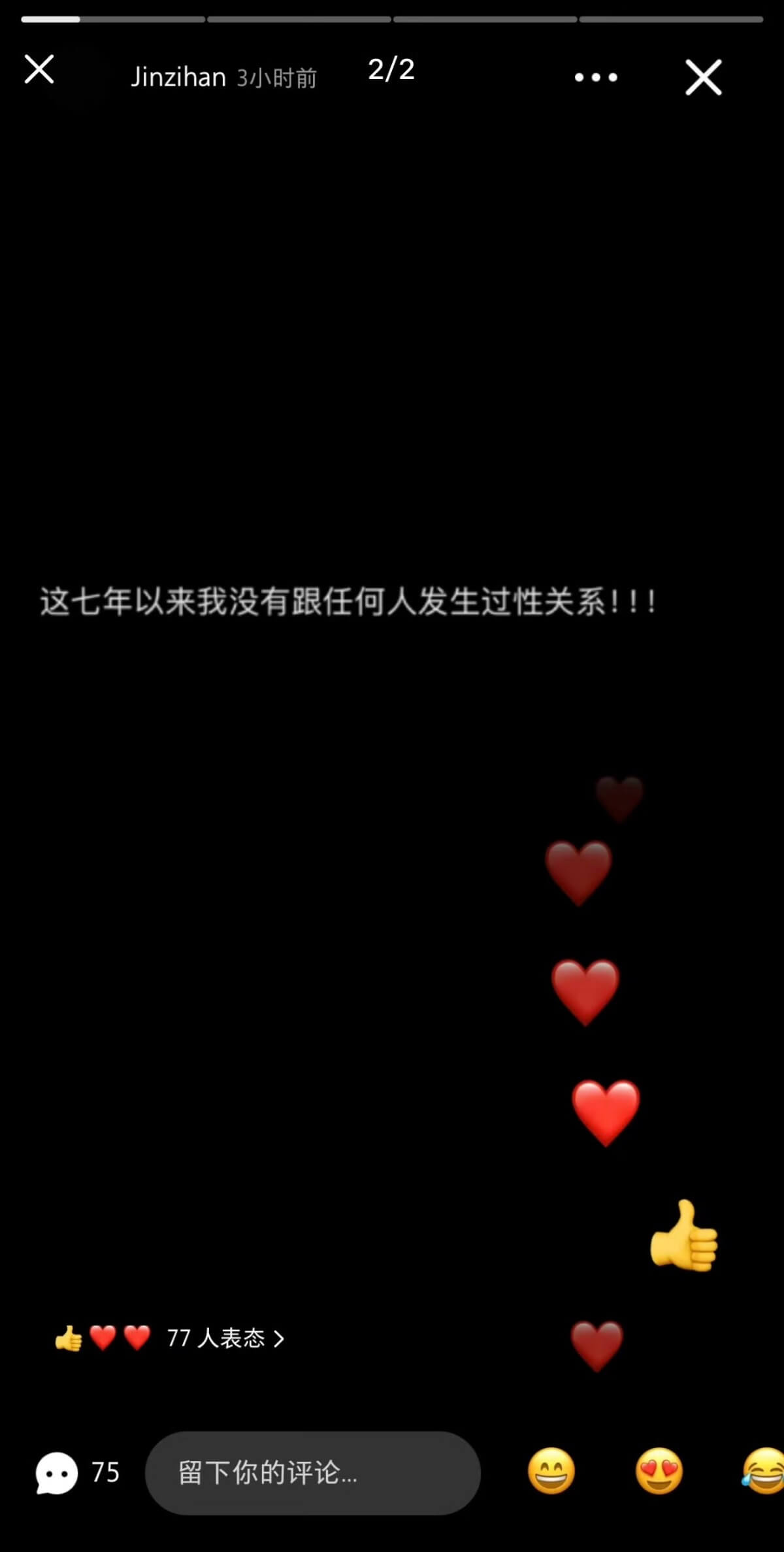 隨著熱議,金子涵再發文回應,強調自己過去七年,沒有和任何人發生過性關係!