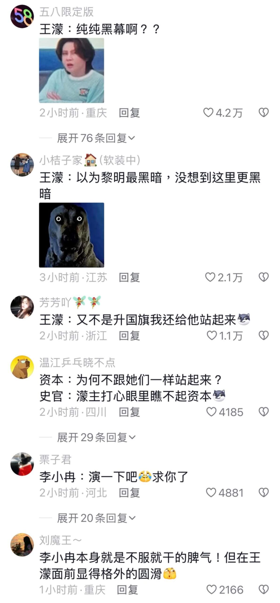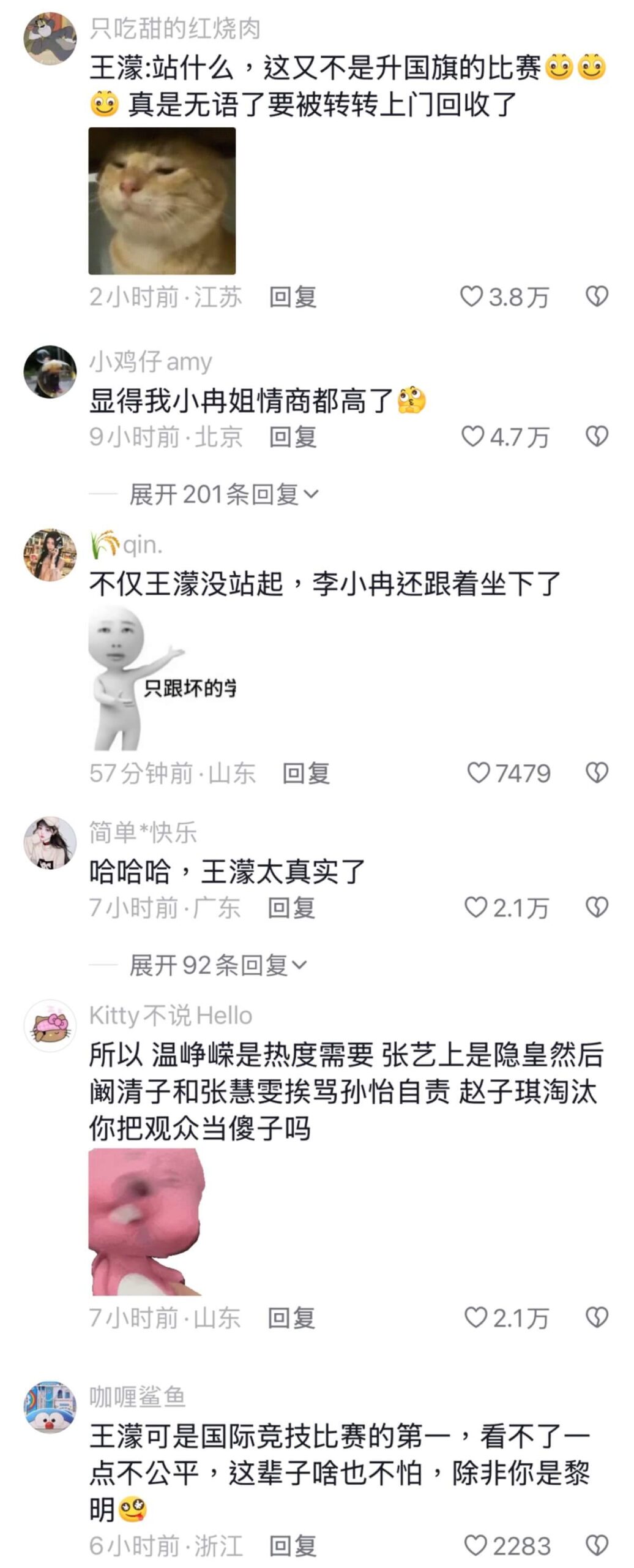 當時組長李小冉發現,除了她們組其他姐姐都站起來了,起身之餘還拉了身邊的王濛,沒想到王濛直接甩開李小冉的手拒絕起立,一句「搞體育的最見不得這種」說出了所有人的心聲。