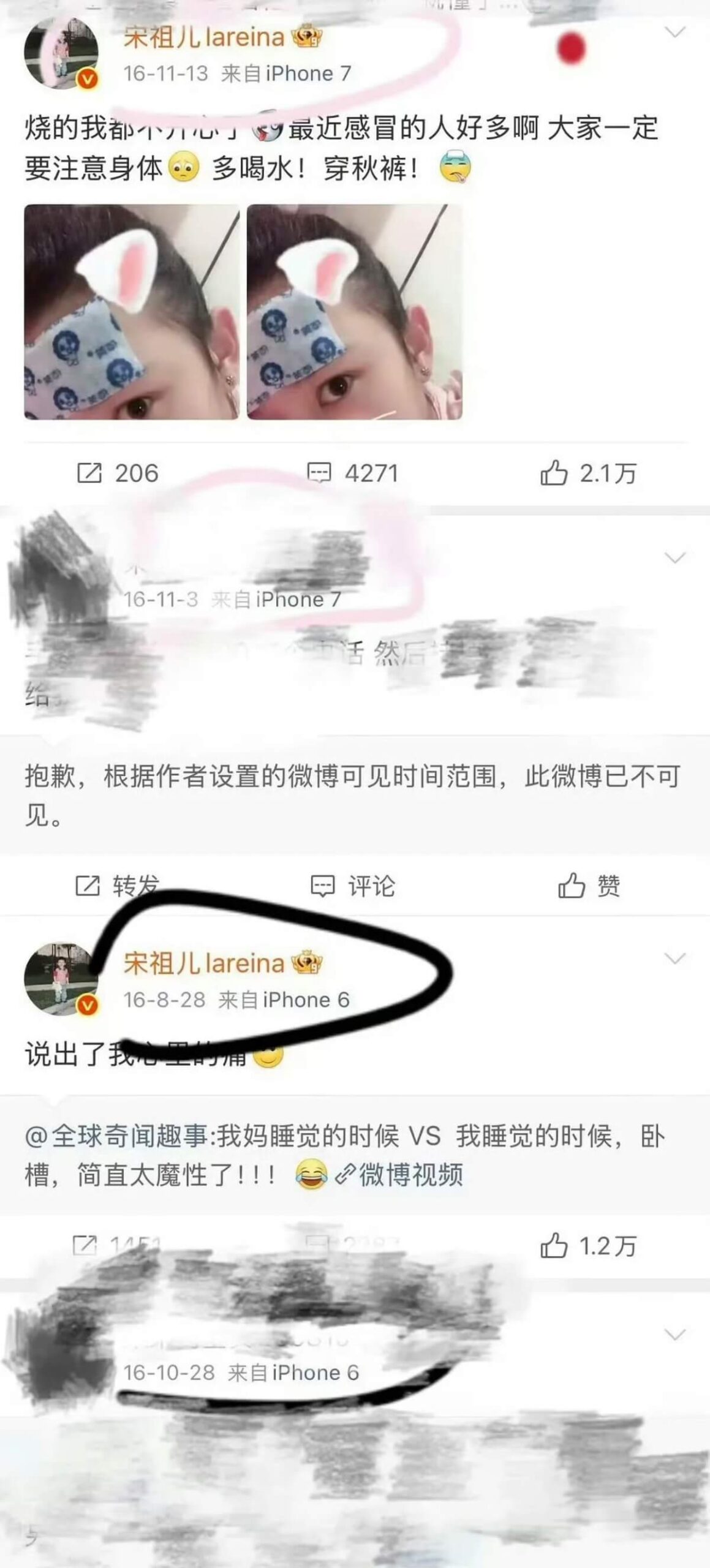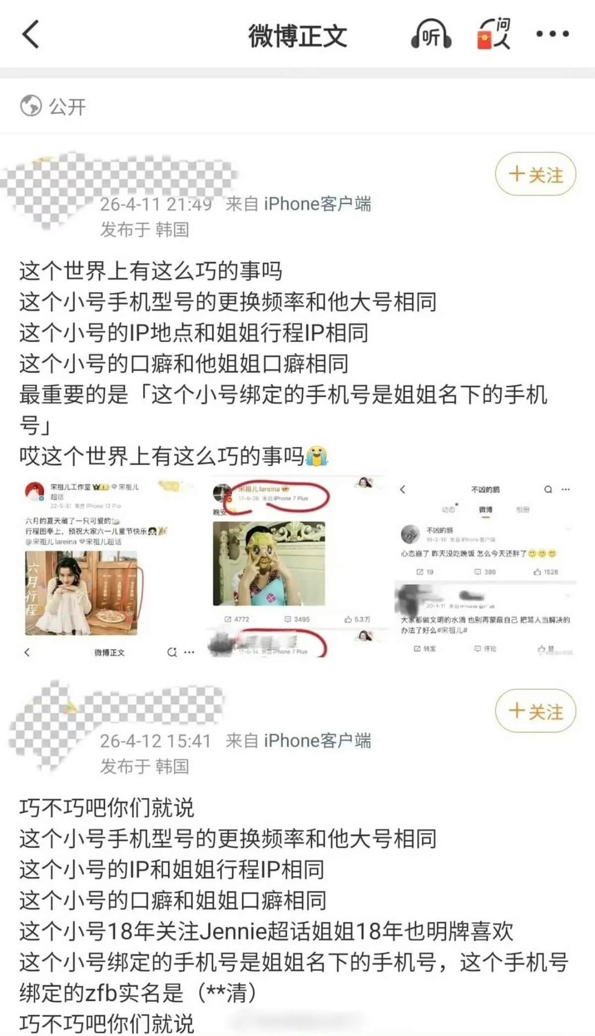 此帳號曝光與宋祖兒大號的手機型號更換時間完全一致(如2016年使用iPhone6、2017年換為iPhone7 Plus),且多次發布動態的IP地址與宋祖兒公開行程所在地吻合。