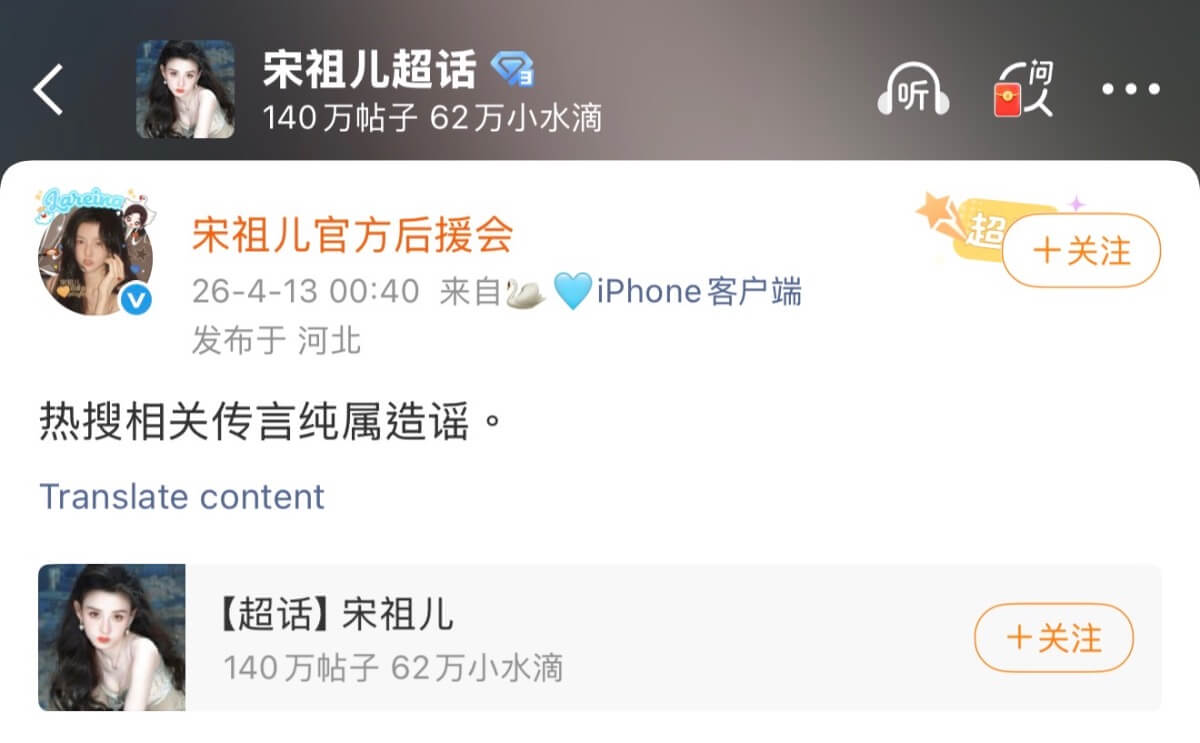 宋祖兒後援會深夜回應,表示網傳帳號是假的⋯但工作室沒有回應👇