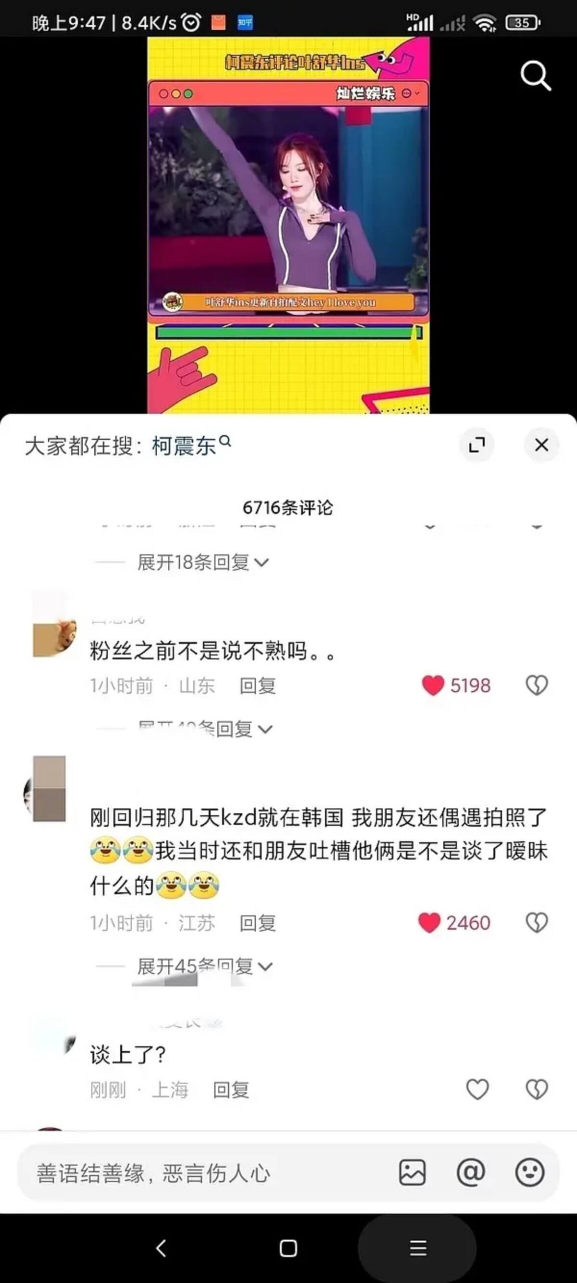 隨後,葉舒華發美照配文「i love you」,結果柯震東現身評論區發了三個愉快的表情,引發戀情猜測。