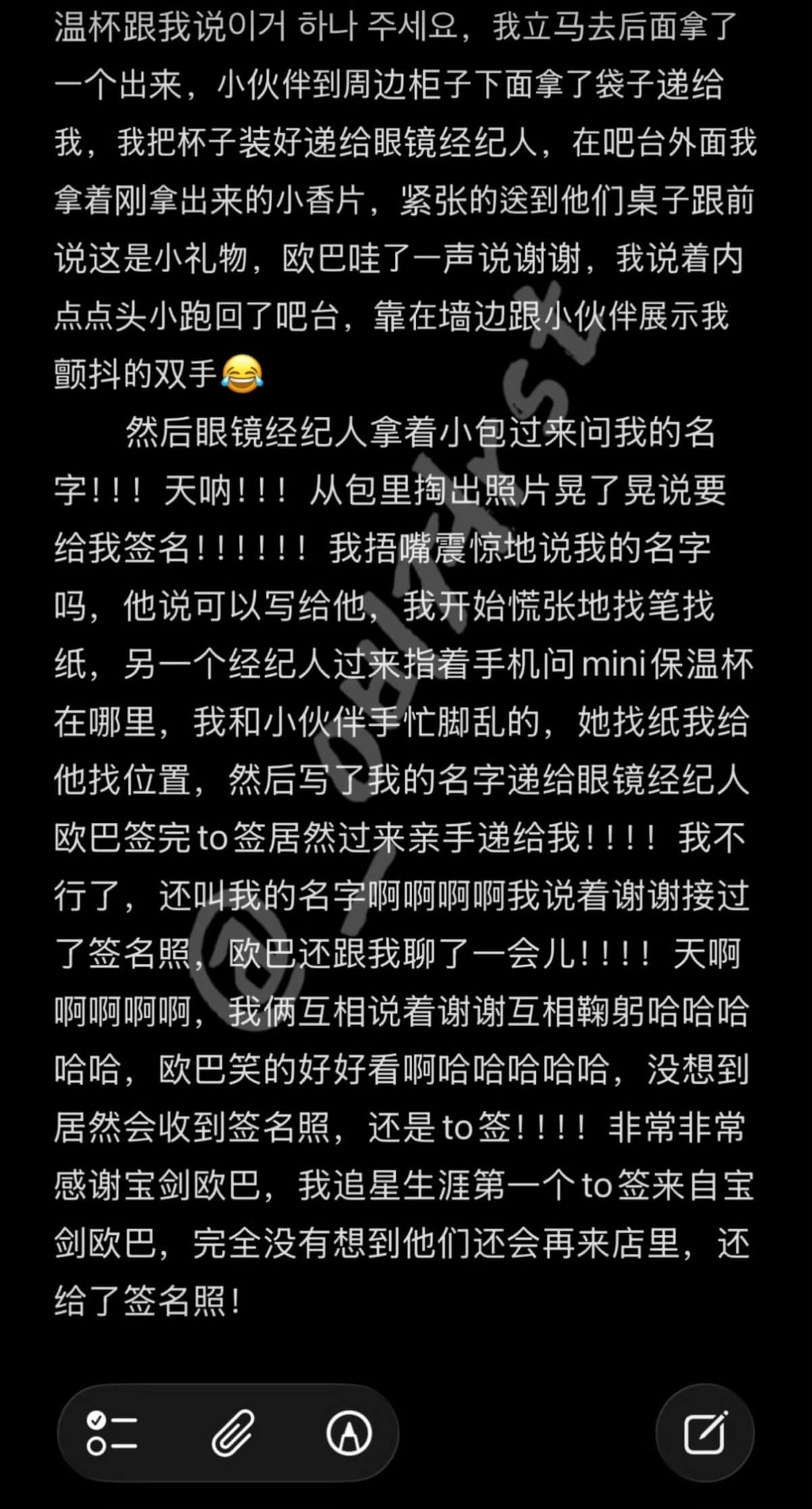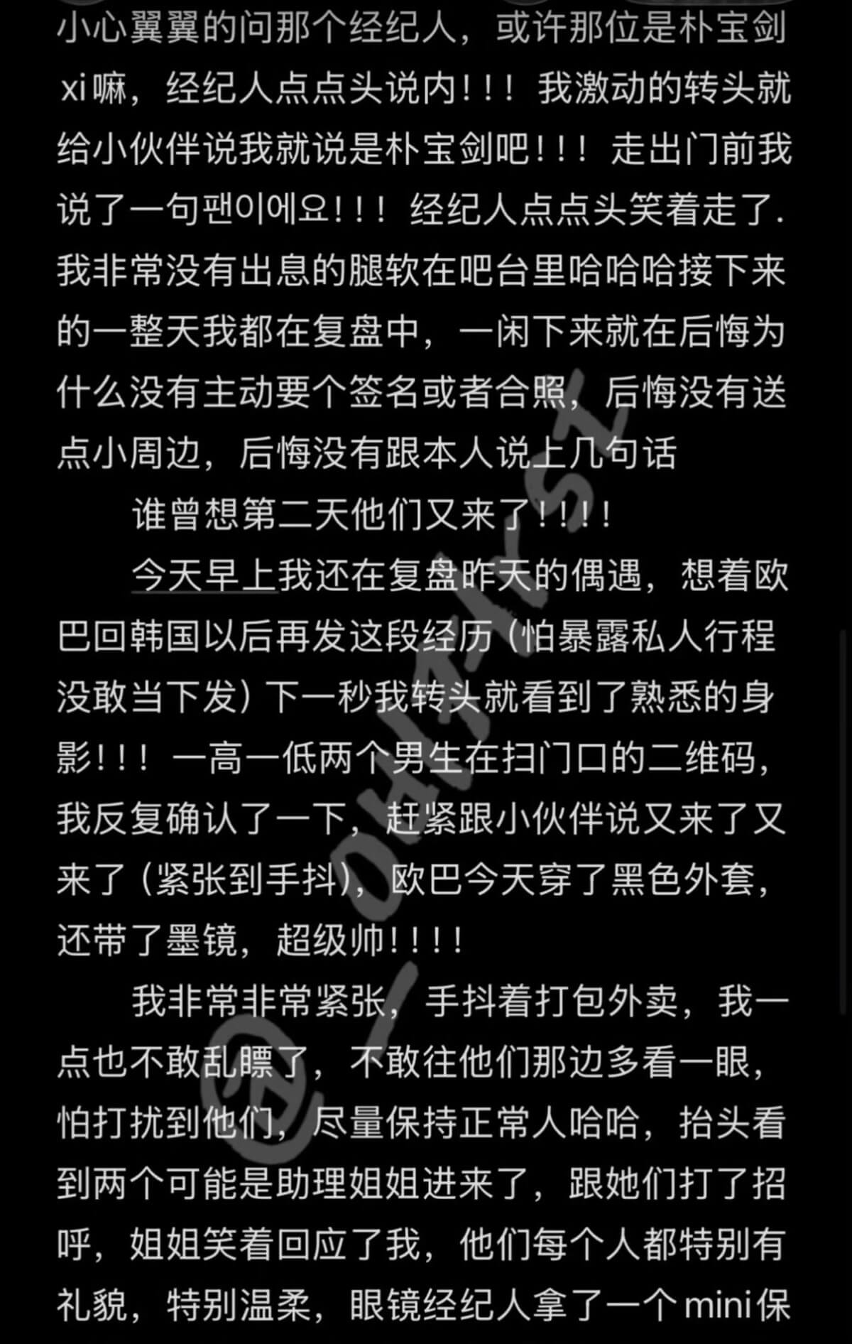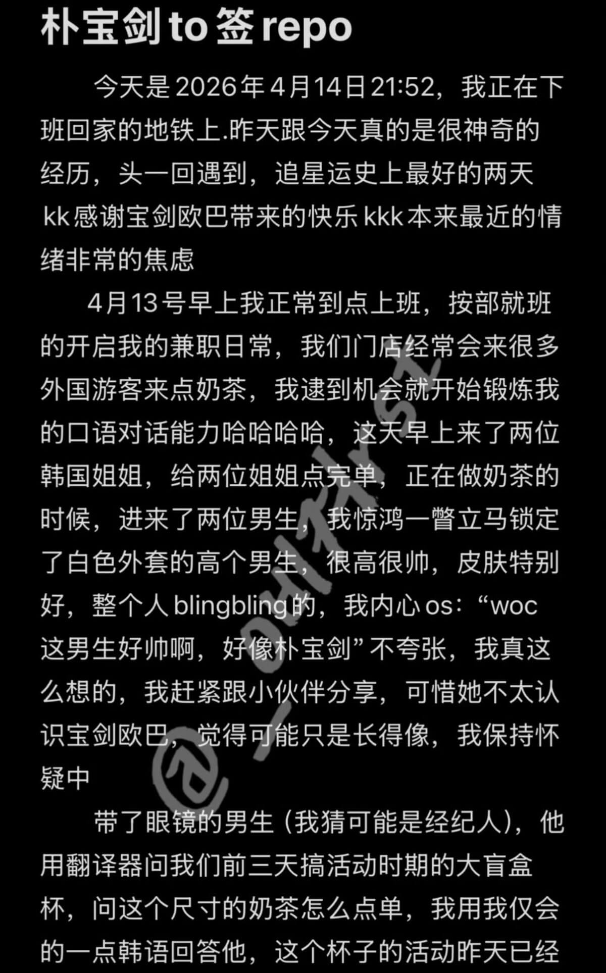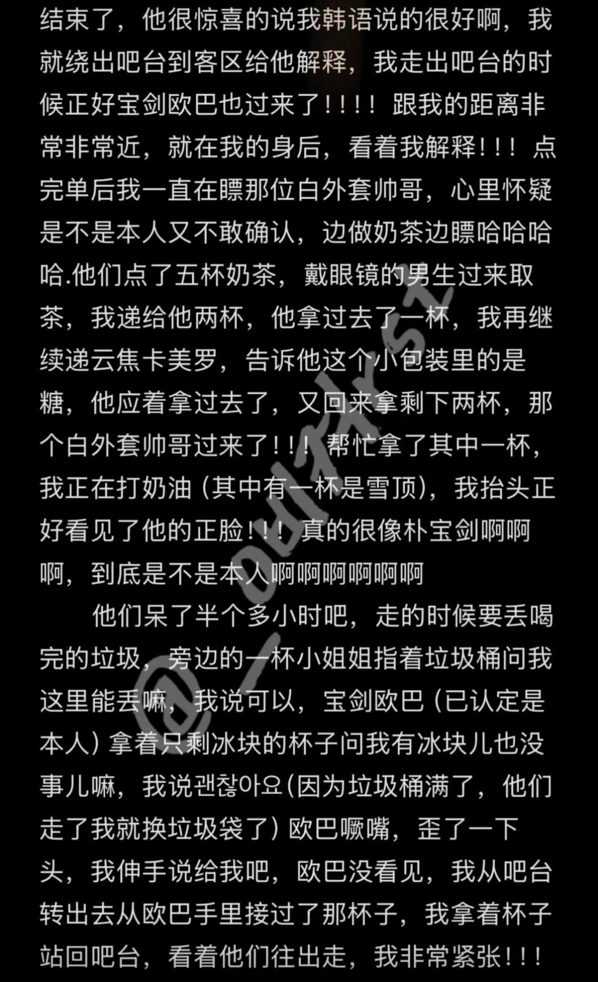 原來寶劍在她任職的奶茶店買過兩次奶茶,第一次原Po一開始沒認出,後來覺得這男生真的也太帥,才發現真的是朴寶劍!