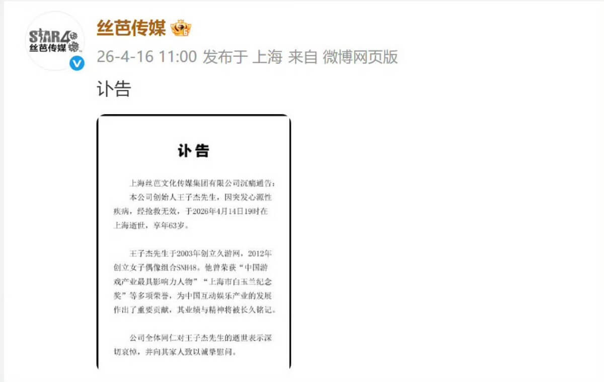 而絲芭傳媒隨後也發了訃告,證實了這項不幸的消息👇