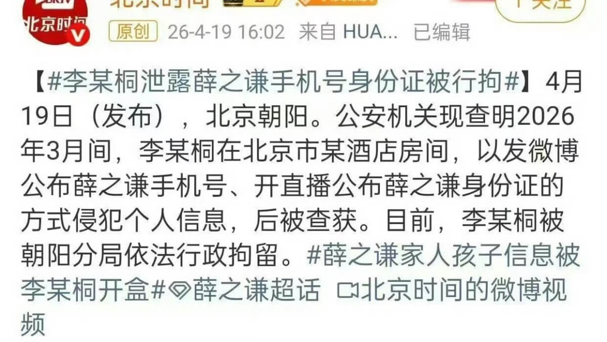 沒想到19號這天居然蹲到了後續,那就是由於李雨桐在微博發文,還在直播中公開薛之謙的手機號、身份證號等個人信息,經公安機關調查,確認其行爲違反《中華人民共和國治安管理處罰法》,構成侵犯公民個人信息。