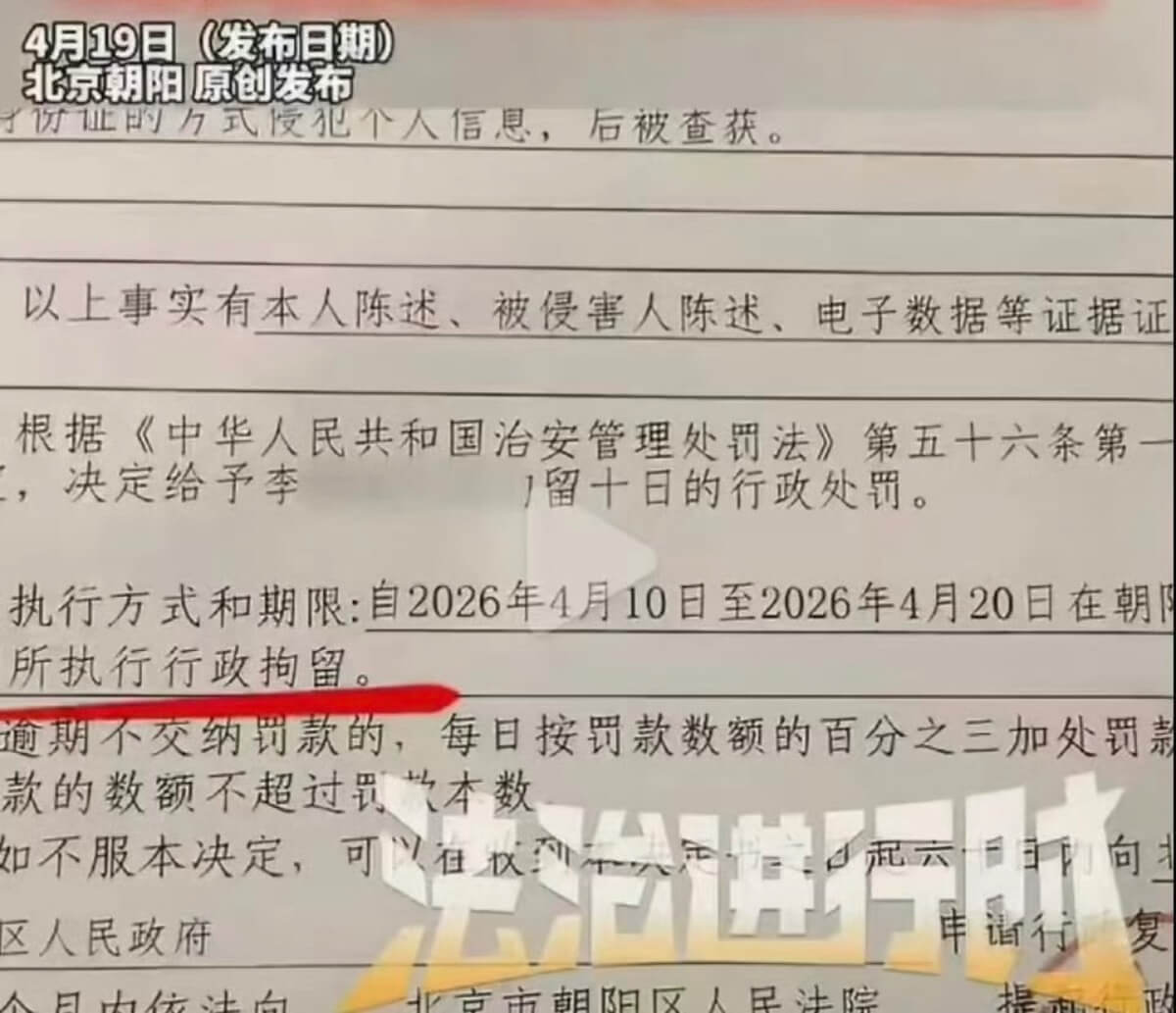 因此,北京市公安局朝陽分局對李雨桐作出了行政拘留十日的處罰,執行日期爲4月10日至4月20日。
