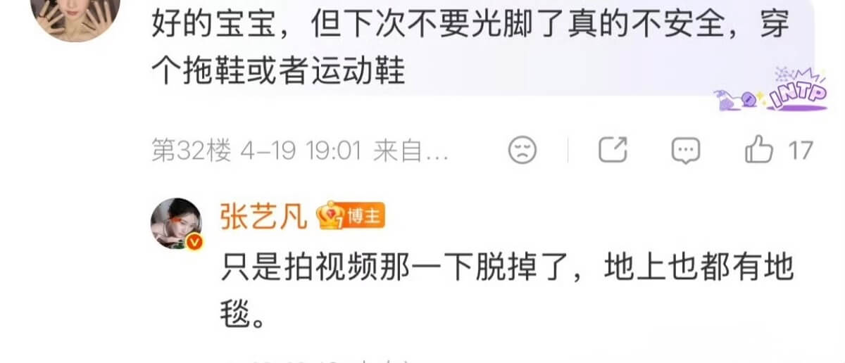 在上了熱搜之後,張藝凡發文解釋,表示是她自己主動的:「是我自己脫鞋的,沒有任何人要求我。」