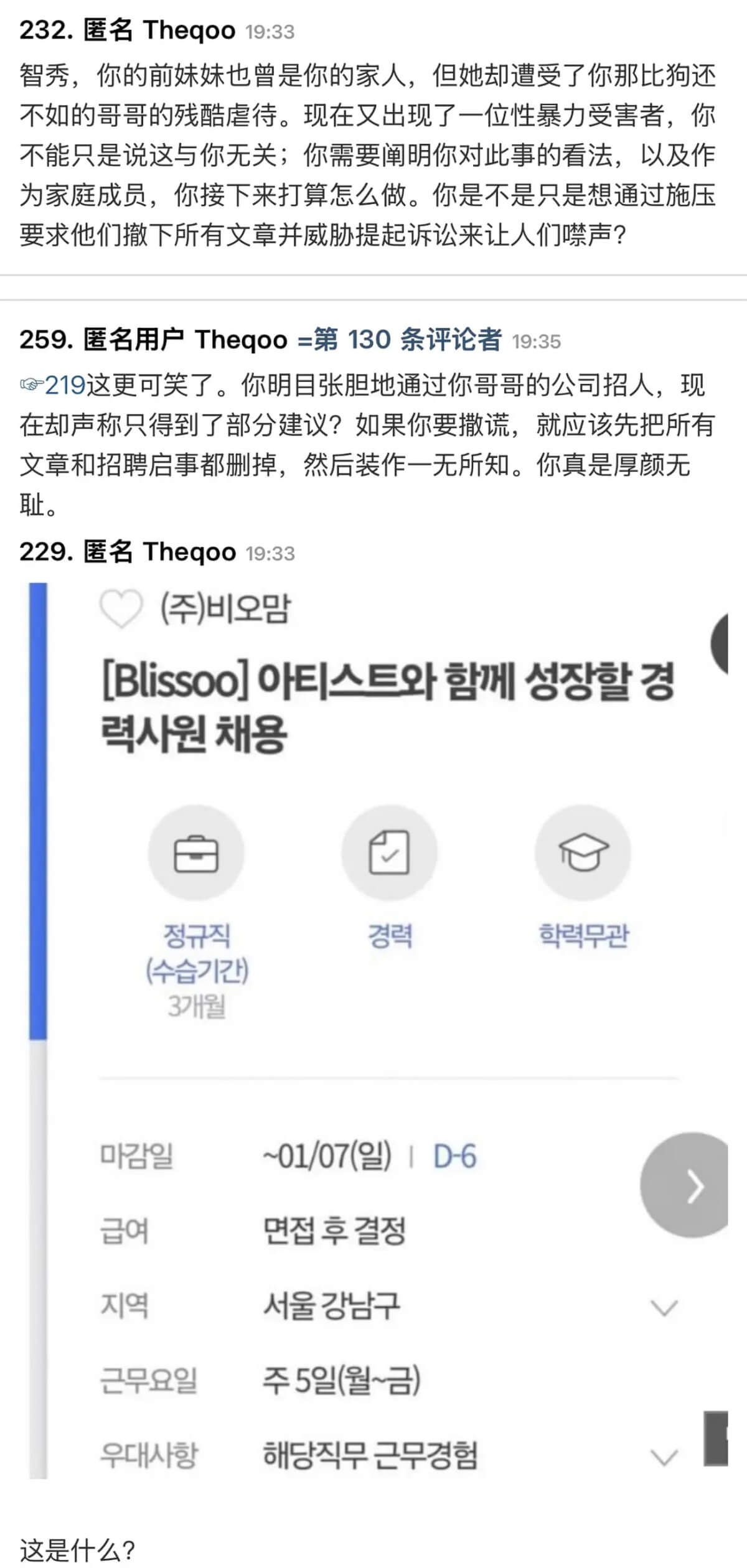 這次發聲究竟在韓國網友間有什麼回應呢?基本上分成兩派激辯中!一派認為聲明中已經否認了網傳爭議,包括了傳智秀公司給予哥哥法律和資金上的援助,所以不應該再將過錯牽扯到智秀身上👇